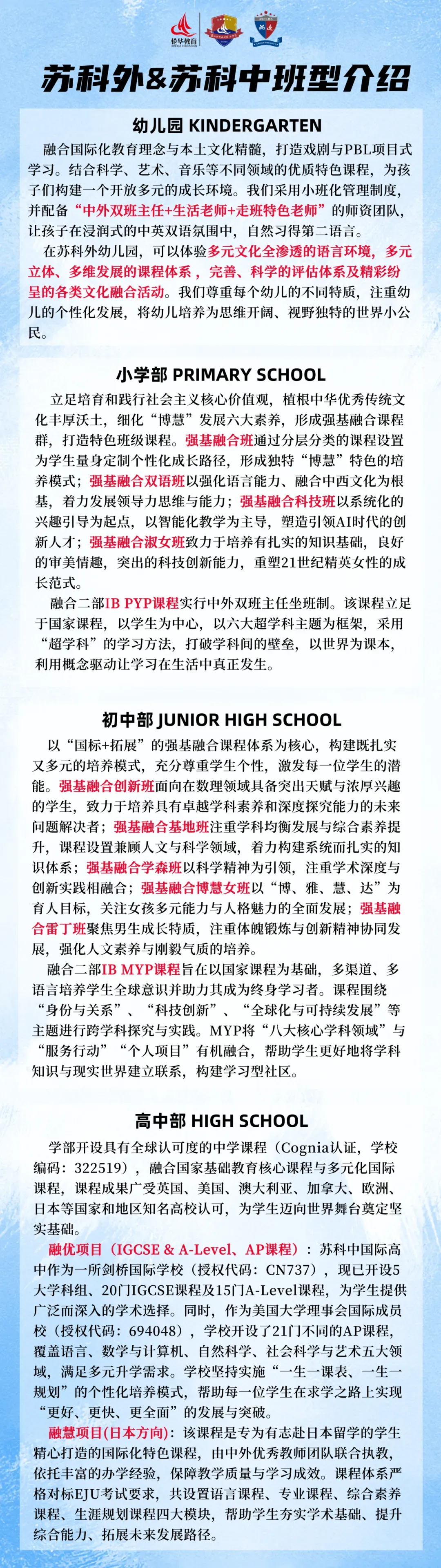 我们坚信,教育的魅力在于提供选择。因此,我们真心做教育,坚持“以生为本”。在苏科外高中部,我们为学生提供上百种课程组合,真正实现“一生一规划、一生一课表”。正因如此,办学仅七届的国际高中,已连续四年收获牛津、剑桥录取,并实现对东京大学、苏黎世联邦理工学院等全球顶尖名校的全覆盖,新加坡国立大学、香港大学、美国莱斯大学等世界名校offer纷至沓来。