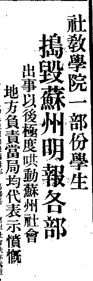 讵料至九点三十五分,即有社教学院少数学生,纠同盲从同学,闯入(苏州)明报编辑室。其时,记者正起床洗脸,该学生等,声势汹汹,声称我们是社会教育学院学生,总编辑在吗?记者即答称不在。继谓你们负责人在哪里?并说:你们为什么要登载我们的新闻?又陆续来二十余人,站立于编辑部写字台之周围,对记者怒目而视,记者婉言谓各位请坐,有何贵干?话未终了,即有衣黑色美式外套者喊:打了再讲。即从袖中取出剪刀剪短电话线,开始肆意打砸。……一声喝打,出铁尺铁锤等,肆意将编辑部等处什物器具一并捣毁,拳打足踢,秩序大乱。门前中华制版社也被捣毁,随后这群学生又赶往马医科苏州明报营业部、印刷部,分别捣毁。(按:报纸上刊出了捣毁的场景,但据我判断,情况并不严重,因为次日《苏州明报》还能正常出刊)。明报广告部职员方蝶衣被殴伤,制版社职员缪镜清被击破头颅,其他还有五六人受了轻伤。