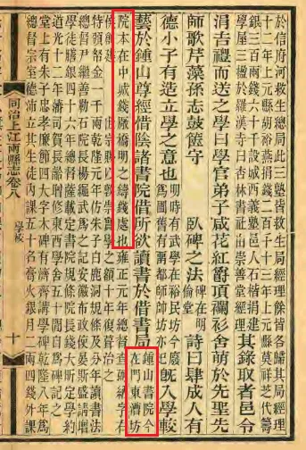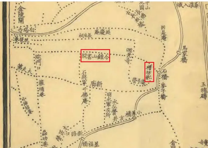 《同治上江两县志》载卷五《城厢考》载:“新廊,有钟山书院,详学校。”“书院今移建新廊,而旧址遂废。”卷八《学校考》载:“钟山书院今在门东漕坊院,本在中城钱厂桥,明之铸钱处也。雍正元年,总督查弼纳字右侯创建,世宗赐以‘敦崇实学’之额。”卷十一《建置考》载:“旧钟山书院在钱厂桥,今毁。改建于东花园回光寺,规制稍狭矣。”卷二十七上《两县城内图第十三》显示,钟山书院与新廊、回光寺、槽坊巷同在一个区域。