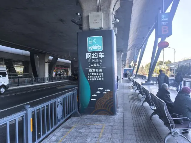 网约车上客点位于机场到达层6号门对面,上客点分为A、B、C,D四区。