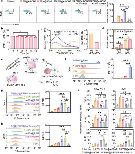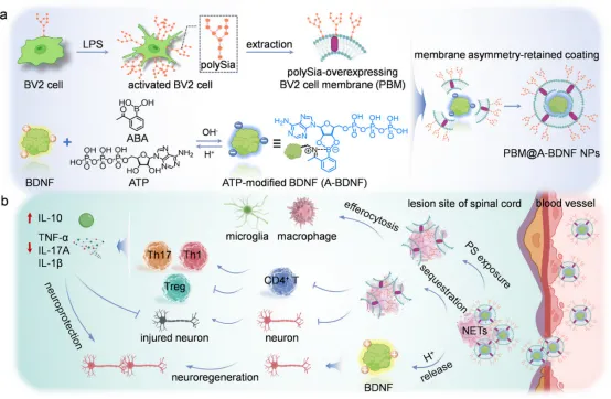 三、研究逻辑链条构建ATP修饰的BDNF纳米粒(A-BDNF NPs)→ 包被polySia过表达的小胶质细胞膜(PBM)形成INPT → 静脉注射后靶向聚集于脊髓损伤区 → polySia与NETs结合并诱导膜脱落 → 暴露PS信号,启动胞葬作用清除NETs → 酸性微环境触发BDNF释放 → 协同实现抗炎与神经再生。