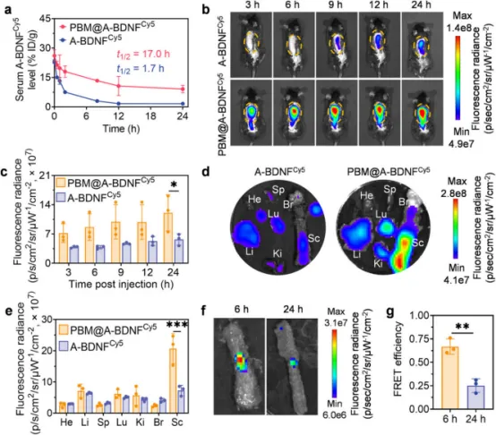 ▪ 微环境触发药物释放:在损伤部位微酸性环境中,纳米核心恢复为天然BDNF,促进神经突起生长与髓鞘修复(见 Fig 3g, 6)。