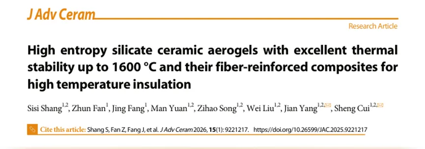 相关研究成果以“High entropy silicate ceramic aerogels with excellent thermal stability up to 1600 °C and their fiber-reinforced composites for high temperature insulation”为题发表在Journal of Advanced Ceramics期刊上.
