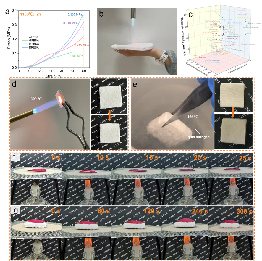 基于此,南京工业大学材料科学与工程学院崔升教授团队成功制备了单硅酸盐高熵陶瓷气凝胶,并利用高熵效应显著提升了材料的高温热稳定性。在1600 ℃条件下保温2 h后仍未发生明显烧结,表现出优异的抗高温失稳能力。此外,还进一步构筑了多种纤维增强陶瓷气凝胶复合材料,其室温热导率低至0.032 W/(m·K),在1000 ℃高温下仍仅为 0.108 W/(m·K)。该复合材料在−196至1300 ℃的宽温区极端条件下均未出现可见损伤或形变,而且即使经历20次高温热循环(1300 ℃,2 h),材料仍保持较低的热导率和较高的抗压强度。这一特性对于极端环境应用至关重要。