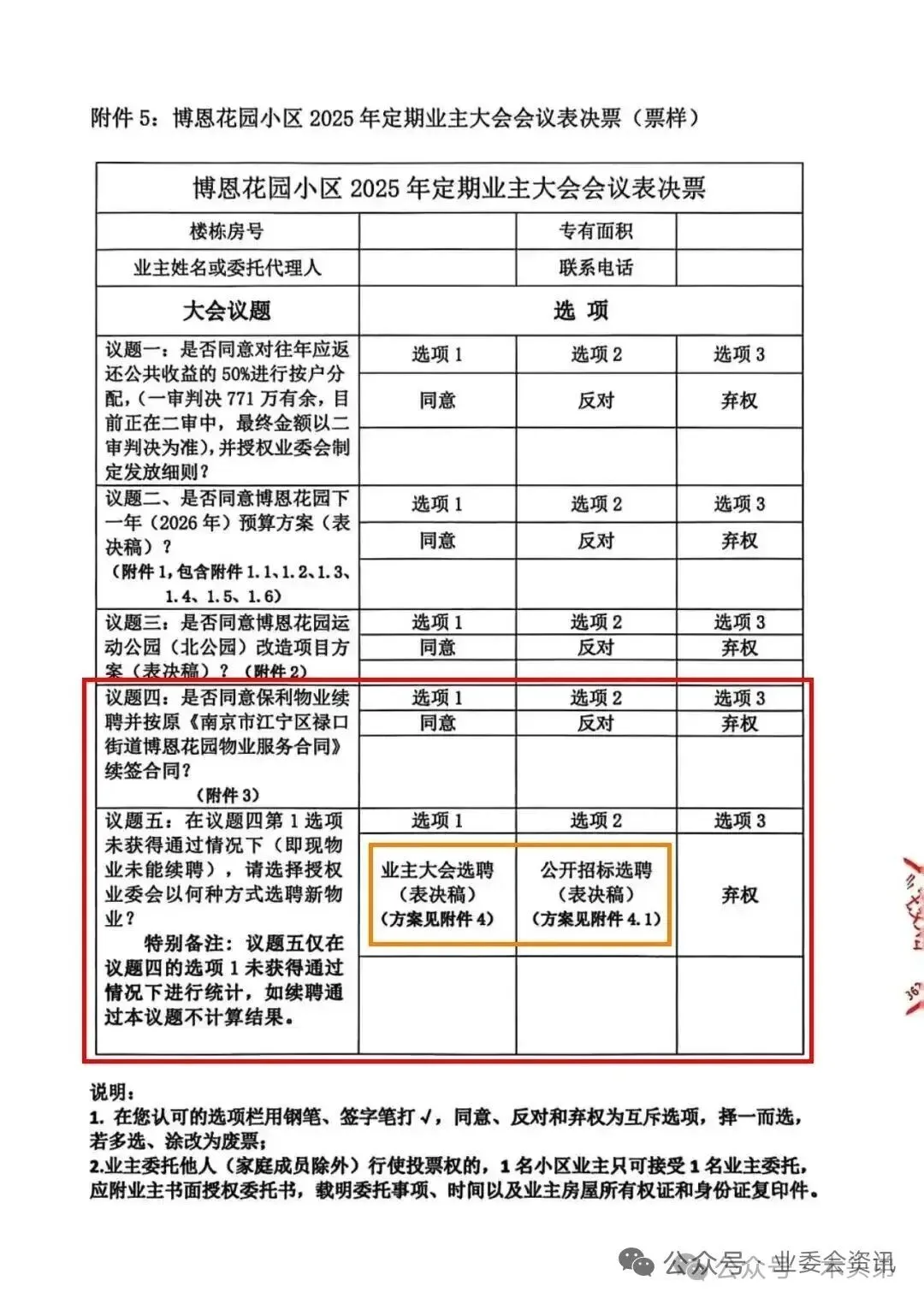 5、在议题四未获得通过情况下(即现物业未能续聘),择授权业委会或以业主大会选聘或招投标选聘新物业(二选一)。