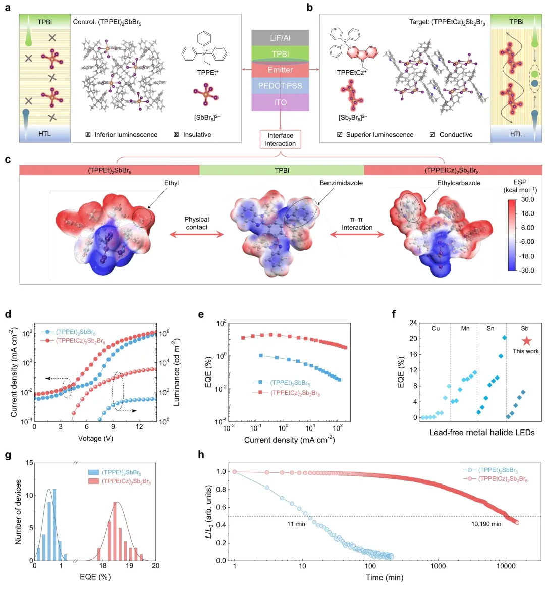 图 1、锑卤化物 LED 的设计理念与电致发光性能。a)基于对照样品(TPPEt)2SbBr5和 b)目标样品(TPPEtCz)2Sb2Br8发射体的器件结构示意图,突出显示有机阳离子的化学结构;c)(TPPEt)2SbBr5、TPBi 和(TPPEtCz)2Sb2Br8的静电表面电势,强调发射体与 TPBi 之间的界面相互作用;d)(TPPEt)2SbBr5和(TPPEtCz)2Sb2Br8基 LED 的电流密度 - 电压 - 亮度曲线;e)外量子效率(EQE)- 电流密度曲线;f)最先进的无铅金属卤化物 LED 的最大外量子效率(EQE);g)(TPPEt)2SbBr5和(TPPEtCz)2Sb2Br8基 LED 的峰值外量子效率(EQE)统计直方图;h)两种 LED 的半衰期测试结果。