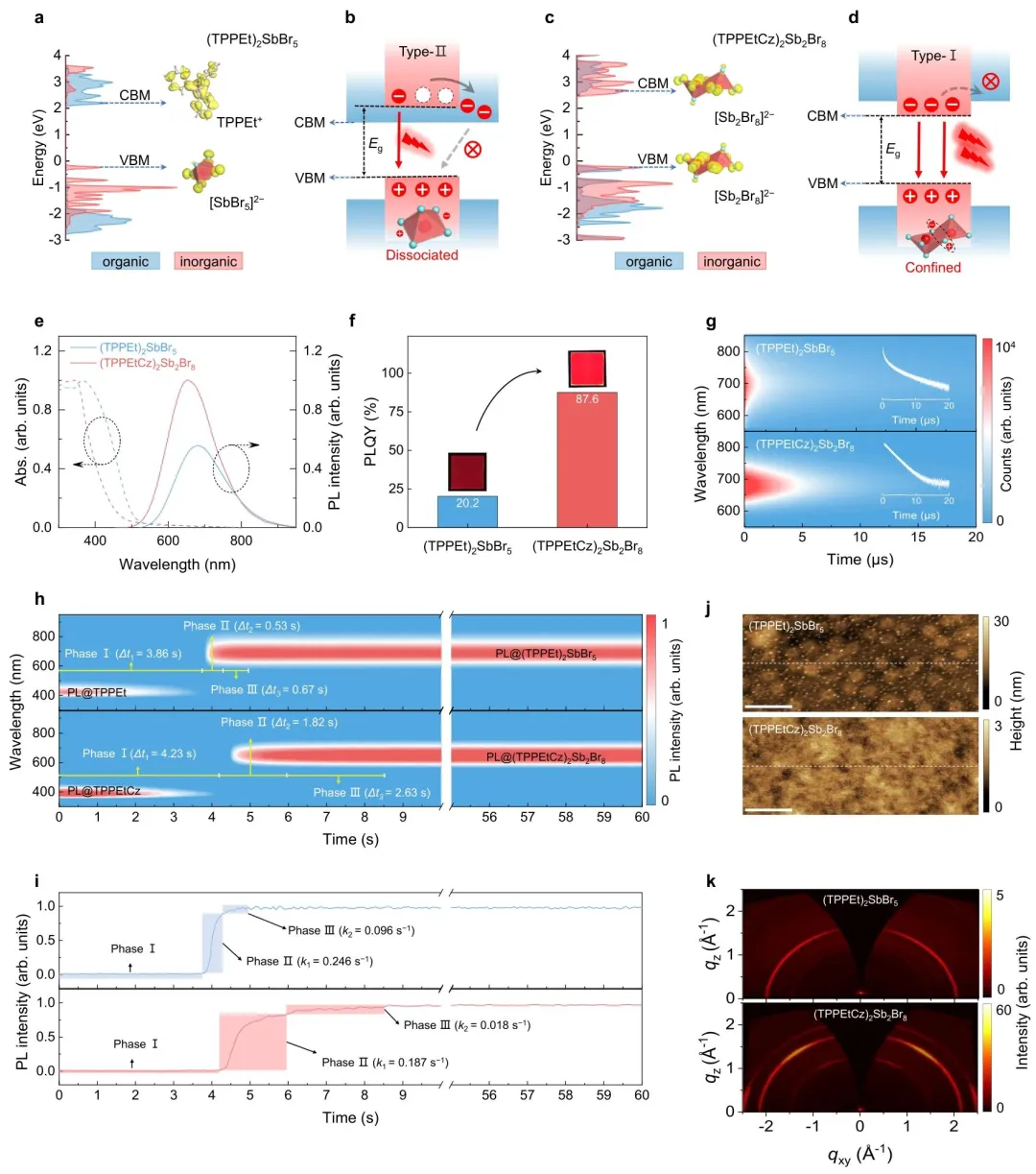 图 2、锑卤化物薄膜的电子结构、光学和形貌特性。a)(TPPEt)2SbBr5和 c)(TPPEtCz)2Sb2Br8的投影态密度(pDOS)图,重点展示价带顶(VBM)和导带底(CBM)的电荷密度图;b)(TPPEt)2SbBr5和 d)(TPPEtCz)2Sb2Br8的能级排列示意图,包括激子形成、转移和辐射复合过程的演变;e)两种薄膜的紫外 - 可见吸收和光致发光(PL)光谱;f)光致发光量子效率(PLQY);g)时间分辨光致发光(PL)光谱的伪彩色图;h)两种薄膜在旋涂过程中的原位光致发光(PL)光谱;i)从原位光致发光(PL)光谱中提取的光致发光(PL)强度演变曲线;j)两种薄膜的原子力显微镜(AFM)图像(比例尺:1 μm);k)两种薄膜的掠入射广角 X 射线散射(GIWAXS)图谱。