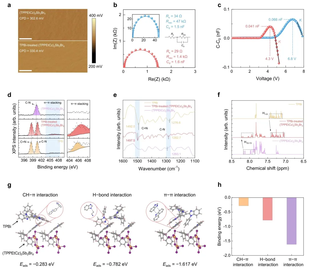 图 3、π−π相互作用对电荷传输的影响。a)(TPPEtCz)2Sb2Br8和 TPBi 处理的(TPPEtCz)2Sb2Br8薄膜的开尔文探针力显微镜(KPFM)图像(比例尺:1 μm);b)基于(TPPEt)2SbBr5和(TPPEtCz)2Sb2Br8薄膜的器件的电化学阻抗谱(EIS)曲线;c)两种 LED 的低频(f=5 kHz)电容 - 电压(C-V)曲线;d)纯 TPBi、TPBi 处理的(TPPEtCz)2Sb2Br8和纯(TPPEtCz)2Sb2Br8的 N 1s 高分辨 X 射线光电子能谱(XPS);e)红外光谱(FTIR);f)质子核磁共振(¹H NMR)光谱;g)TPBi 与(TPPEtCz)2Sb2Br8的三种吸附模型结构;h)三种吸附模型的吸附能(Eads)对比。