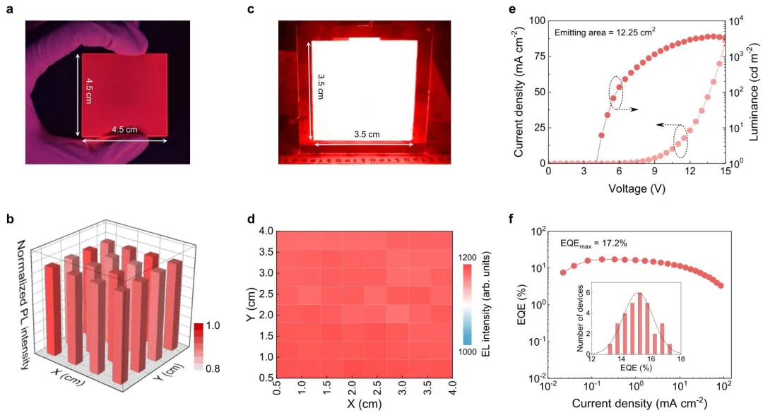 图 4、大面积器件的展示。a)在紫外光照射下,发光面积为 4.5×4.5 cm² 的大面积(TPPEtCz)2Sb2Br8薄膜的光致发光(PL)照片;b)大面积薄膜的光致发光(PL)强度分布;c)发光面积为 3.5×3.5 cm² 的大面积 LED 在 8.0 V 偏压下的照片;d)大面积 LED 的亮度均匀性统计;e)大面积 LED 的电流密度 - 电压 - 亮度曲线;f)外量子效率(EQE)- 电流密度曲线。