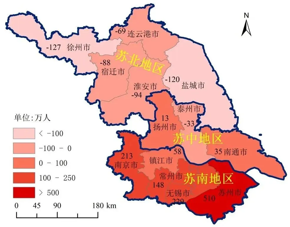 江苏省净流动人口分布地图:居前三位的是苏州510万,无锡229万,南京213万