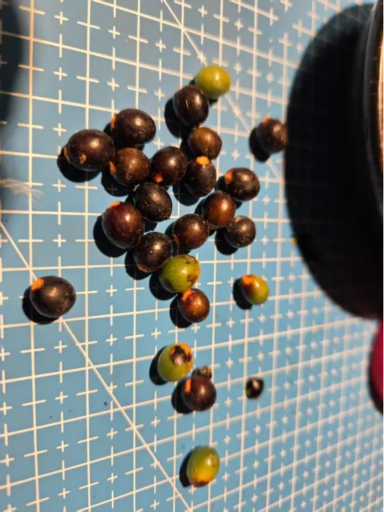 周末逛公园,发现有种植物长得很像竹子,却伸出了橙黄色的长梗,上面还结满了黑色的果实——像是特意伸出手奉上来的。