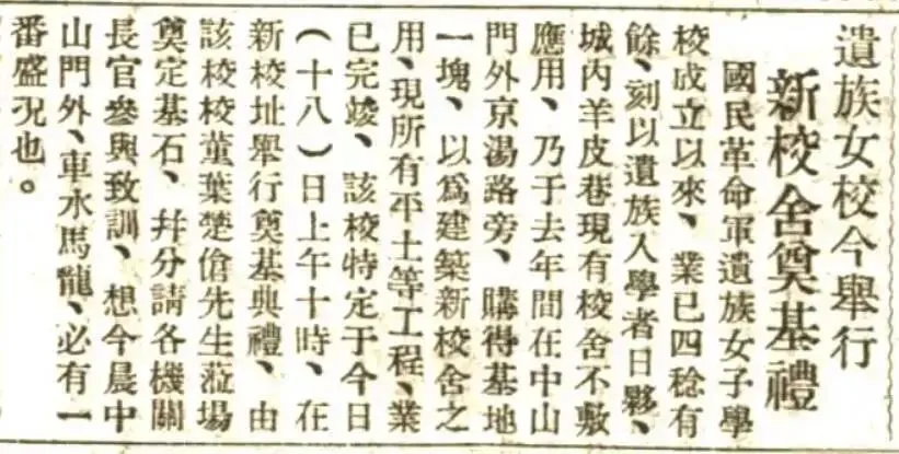 中国国民党于一九二八年十一月召开的某次中央常会(当时中央日报和上海各大报均有刊载),决议创办国民革命军遗族学校于中山陵园,招收北伐大革命中阵亡将士的子女和辛亥革命壮烈牺牲的先烈后代,给予教养。