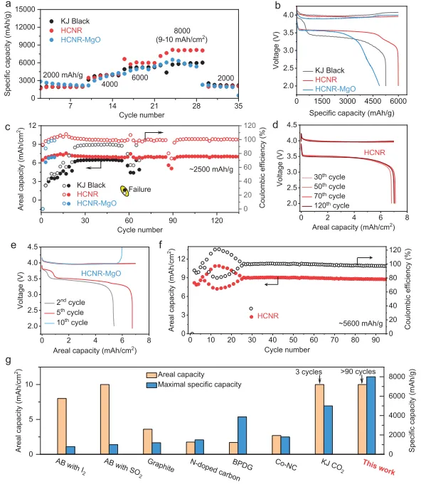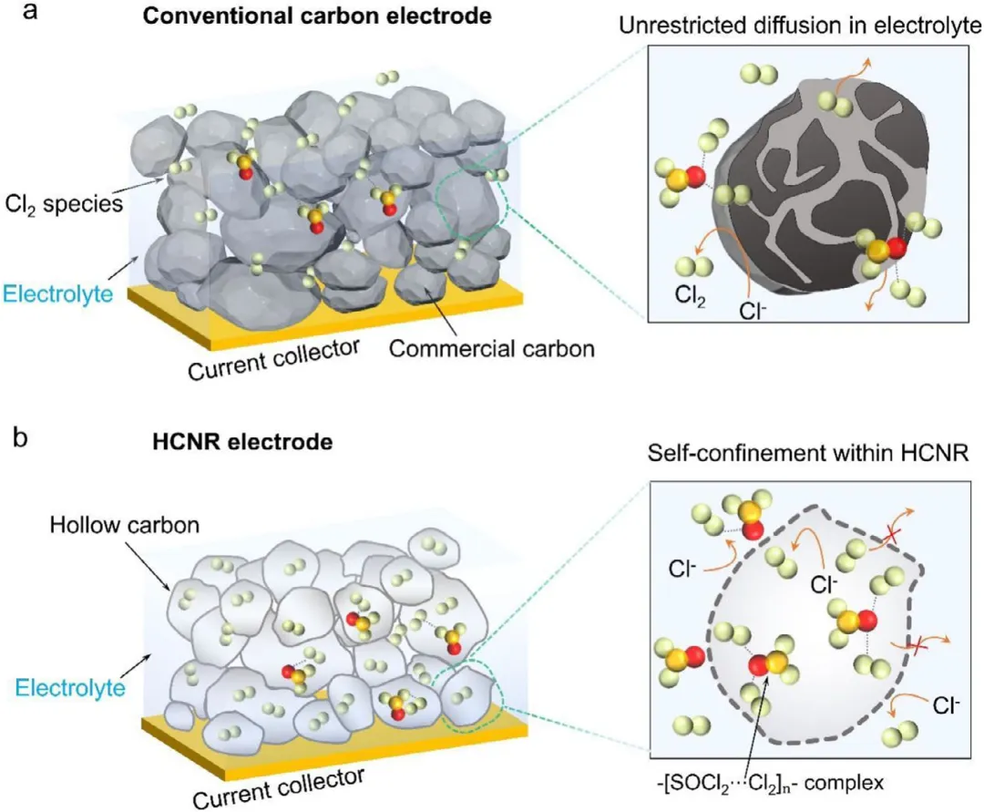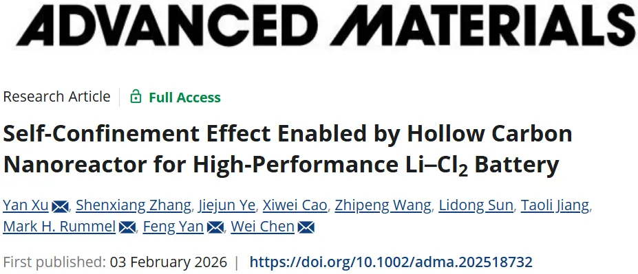 可充电锂-氯电池是一种前景广阔的高能量密度技术。然而,传统正极材料的开孔结构允许Cl₂不受控制地扩散到电解质中,这带来了一个根本性挑战,导致严重的局部浓度稀释,从而影响了倍率性能和比容量。2026年2月3日,苏州大学Yan Xu、严锋、中国科学技术大学陈维、奥斯特拉发技术大学Mark H. Rummel在国际知名期刊Advanced Materials发表题为《Self-Confinement Effect Enabled by Hollow Carbon Nanoreactor for High-Performance Li–Cl2 Battery》的研究论文,Yan Xu、Shenxiang Zhang为论文共同第一作者,Yan Xu、严锋、陈维、Mark H. Rummel为论文共同通讯作者。在此,作者提出了一种利用中空碳纳米反应器(HCNRs)的自分子限制策略,通过其壁上的微孔(约0.8 nm)来调控活性Cl₂物种的局部浓度。这些微孔充当尺寸选择性屏障,阻止了尺寸较大的活性Cl₂物种(动力学直径约0.86 nm)的逸出,而介孔(30–50 nm)则作为纳米反应器富集活性Cl₂物种。这种设计使组装的Li─Cl₂电池在充放电过程中能够实现100 mA cm⁻²的超高电流密度和创纪录的8000 mAh g⁻¹(9 mAh cm⁻²)的比容量,优于已报道的文献。这种中空纳米反应器设计凸显了Li─Cl₂电池作为高功率和高能量密度系统的潜力,为其商业化应用铺平了道路。随着电动汽车和电动飞机需求的不断增长,高能量密度电池的研发日益受到重视。锂离子电池(LIBs)是目前最理想的选择,其能量密度约为250 Wh kg⁻¹。然而,为了延长这些应用场景的续航里程,迫切需要进一步的技术进步。近年来,使用亚硫酰氯(SOCl₂)作为电解质、金属锂作为负极、多孔材料作为正极的可充电锂-氯(Li─Cl₂)电池因其高理论能量密度而备受关注。尽管前景广阔,但这些Li─Cl₂电池系统仍面临着阻碍其实际应用的重大技术障碍。正极材料通常具有开孔结构。这种结构特征使得在电池运行期间,活性Cl₂物种会不受控制地扩散。Cl₂在SOCl₂电解质中的高溶解度使得情况变得更加复杂,导致了可溶性Cl₂络合物的形成。这种开孔结构极大地稀释了正极材料附近的局部Cl₂浓度。这可能导致缓慢的反应动力学和低比容量。此外,逸出的Cl₂导致LiCl优先在隔膜附近沉积,使得正极内部区域缺乏反应物。这可能导致正极的过早失效和有限的比容量。Butler-Volmer方程明确地将反应动力学(j)与正极表面的反应物表面浓度(Cso)关联起来,该方程表明,提高正极-电解质界面处的局部Cl₂浓度可以直接提高反应动力学。因此,作者假设在正极结构内对Cl₂物种进行空间限制可以显著改善电化学性能。中空碳纳米结构在气体储存和离子调控方面已展示出卓越的能力,但其用于分子筛的孔壁工程在Li─Cl₂电池中尚未被探索。作者提出在空心碳壁上设计纳米孔作为分子门,通过尺寸筛分效应将持续生成的-[SOCl₂···Cl₂]n-络合物限制在空腔内。在此,作者提出一种自分子限制策略,使用壁上具有精确设计的亚纳米级纳米孔的N掺杂中空碳纳米反应器(HCNRs),以将-[SOCl₂···Cl₂]n-络合物富集在空腔内。这些纳米孔作为分子筛,允许Li⁺/Cl⁻快速传输,同时物理上阻止了尺寸较大的-[SOCl₂···Cl₂]n-络合物(动力学直径约0.86 nm)的逸出。被限制的-[SOCl₂···Cl₂]n-络合物在介孔中创造了一个局部富集Cl₂的环境,这使得电池能够同时具备超高倍率性能和卓越的容量。所得的Li─Cl₂电池实现了100 mA cm⁻²的电流密度和8000 mAh g⁻¹的容量——这优于所有已报道的数值。值得注意的是,使用HCNRs作为正极材料的Li─Cl₂软包电池在全电池层面展现出约106 Wh kg⁻¹的实际能量密度。作者的研究结果表明,这种中空正极材料设计在解决Li─Cl₂电池能量密度和功率密度之间的权衡问题上具有巨大潜力。本研究提出了一种具有自分子限制效应的中空碳纳米反应器(HCNR)作为Li-Cl₂电池正极,通过其壁上的微孔限制活性Cl₂物种的扩散,从而显著提升了电池的反应动力学、倍率性能和比容量。该研究实现了创纪录的超高电流密度和比容量,并成功验证了软包电池的实际应用潜力,为开发兼具高能量密度和高功率密度的新型储能系统提供了新思路。图1:空心碳纳米反应器(HCNR)的自限域策略设计原理。 (a) 传统商业化碳正极材料(KJ Black)的开放孔隙结构导致Cl₂物种在电解液中无限制扩散,造成局部浓度稀释;(b) HCNR电极通过壁上的微孔(≈0.8 nm)作为尺寸选择性屏障阻挡较大的-[SOCl₂···Cl₂]ₙ复合物(动力学直径≈0.86 nm),同时利用30-50 nm的中空介孔作为纳米反应器富集活性Cl₂物种,实现自限域效应。图2:HCNR的制备与表征。 (a) 未刻蚀MgO模板的HCNR-MgO透射电镜(TEM)图像,显示立方MgO核心外包覆碳层;(b) 刻蚀后HCNR的TEM图像,清晰显示中空结构,插图高分辨TEM显示壁厚约6.0 nm;(c) 商业化KJ Black的TEM图像,显示开放孔隙结构;(d) 77 K下N₂吸脱附等温线,HCNR和KJ Black均呈现典型的II型曲线,HCNR的BET比表面积为1352 m² g⁻¹;(e) 非局部密度泛函理论(NLDFT)孔径分布曲线,微孔集中在0.7-1.0 nm范围;(f) HCNR的总孔容(5.232 cm³ g⁻¹)显著高于KJ Black(2.21 cm³ g⁻¹),归因于中空介孔贡献;(g) Cl₂静态吸附实验,HCNR的Cl₂吸附量(3.5 mmol g⁻¹)远高于HCNR-MgO(0.96 mmol g⁻¹)和KJ Black(1 mmol g⁻¹);(h) Cl₂吸附后的XPS Cl 2p谱,HCNR检测到明显Cl信号而KJ Black无信号;(i) DFT计算的吸附能,吡啶氮与Cl₂的结合能为-0.55 eV,SOCl₂与Cl₂的相互作用能为-0.18 eV。图3:Li-Cl₂电池的电化学性能。 (a) 电化学阻抗谱(EIS)的弛豫