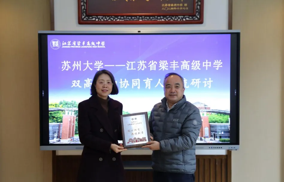 会上,苏州大学还向梁丰高中赠送了“协同育人”纪念牌,标志着两校合作迈入以具体项目为支撑的深度融合新阶段。