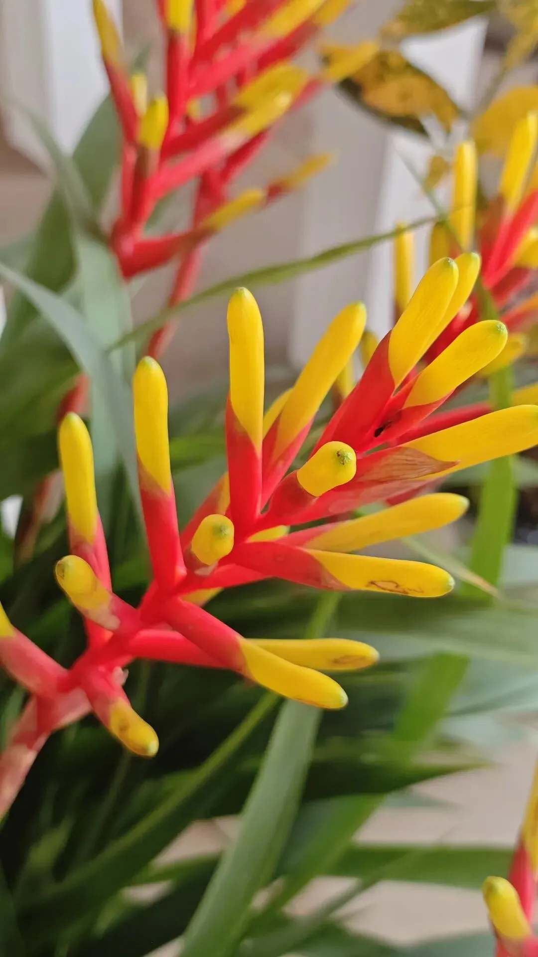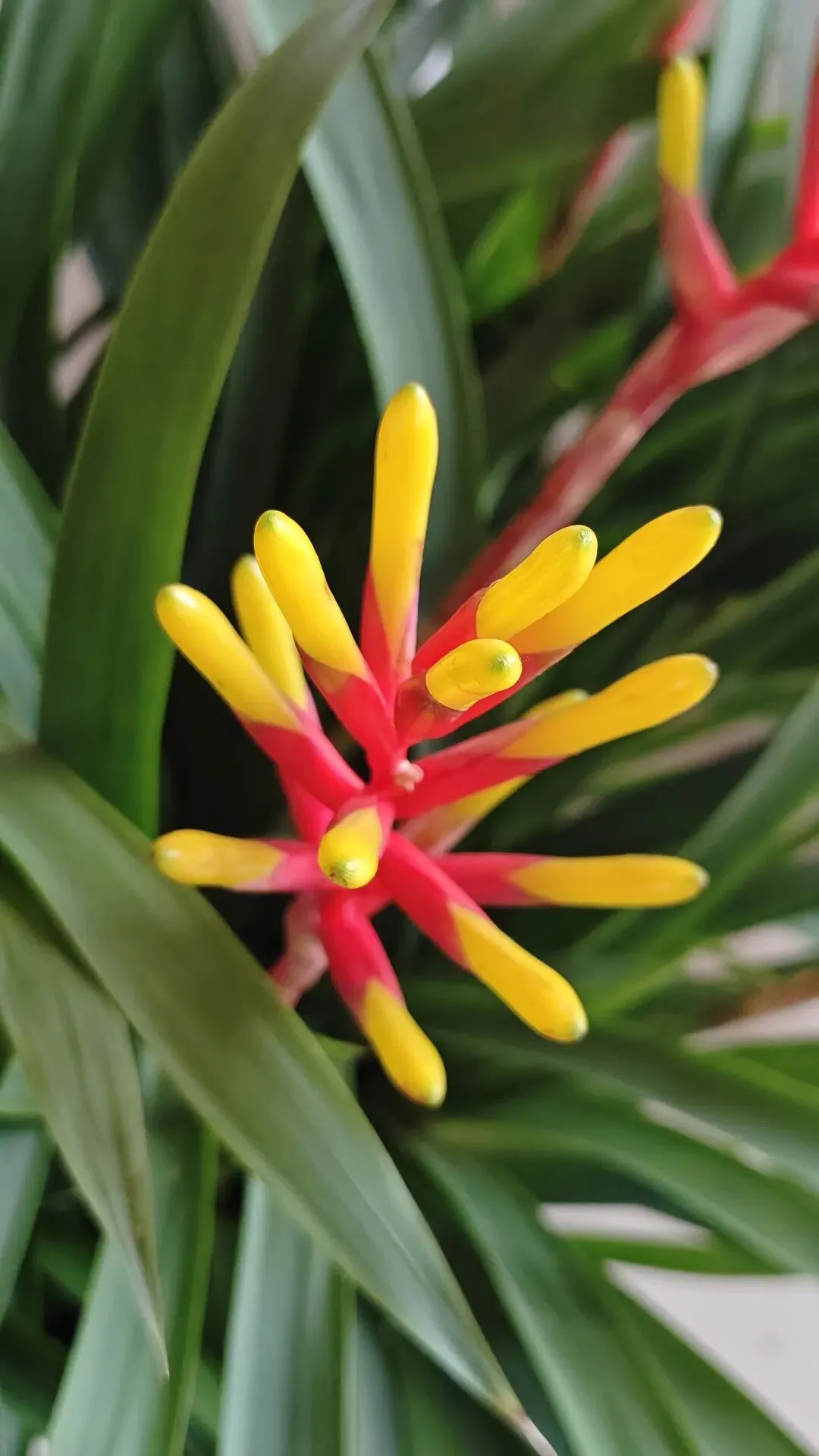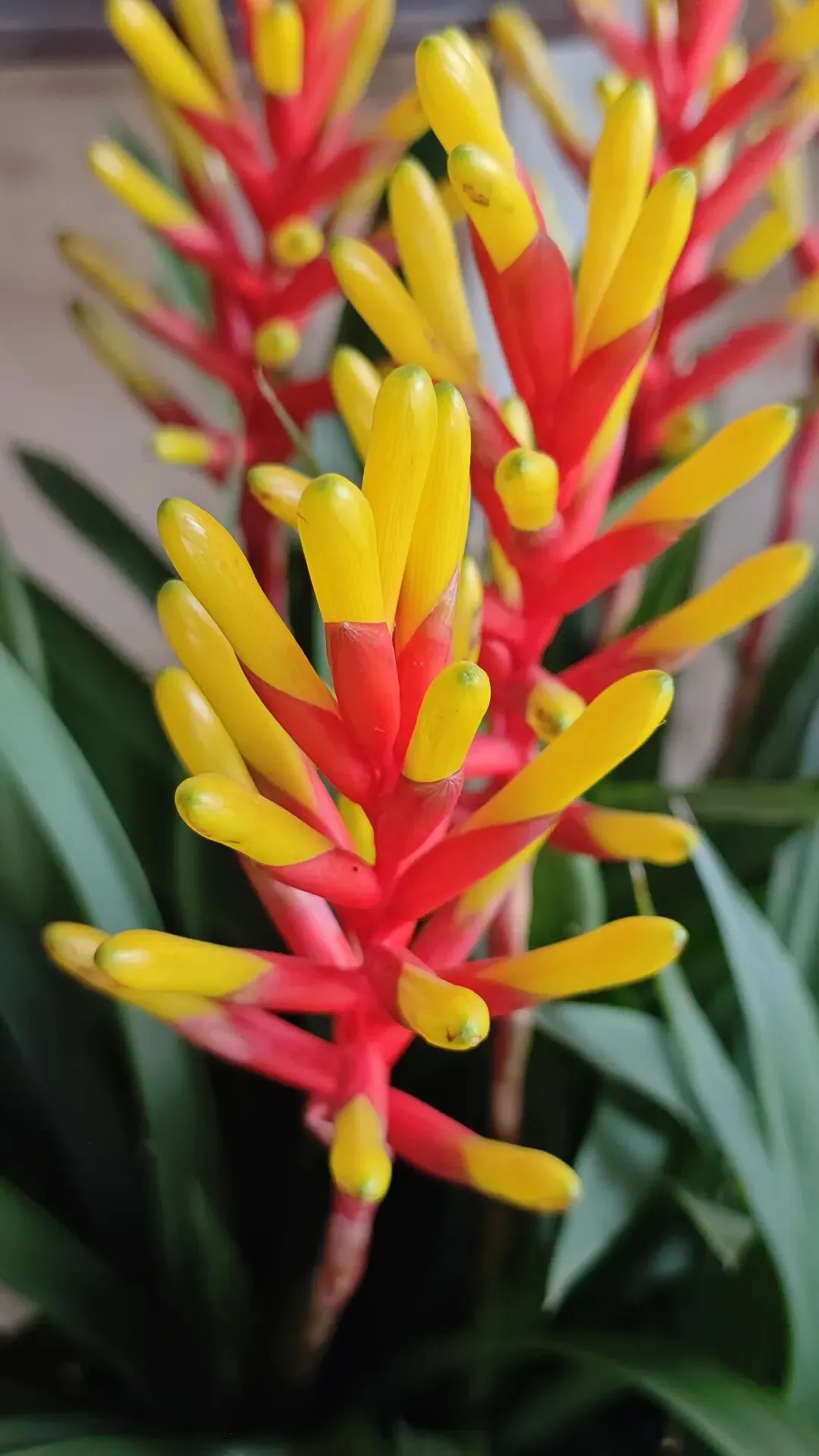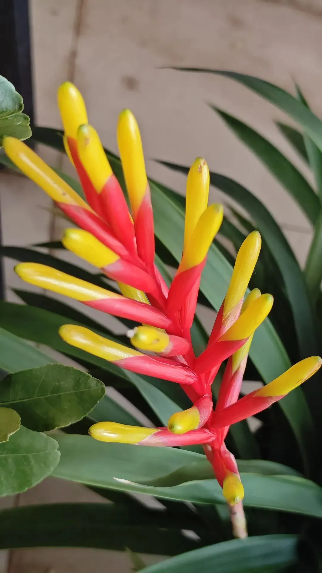 - 花葶挺拔,大型穗状花序,苞片近轴端鲜红、远轴端亮黄,造型酷似一串串鞭炮;