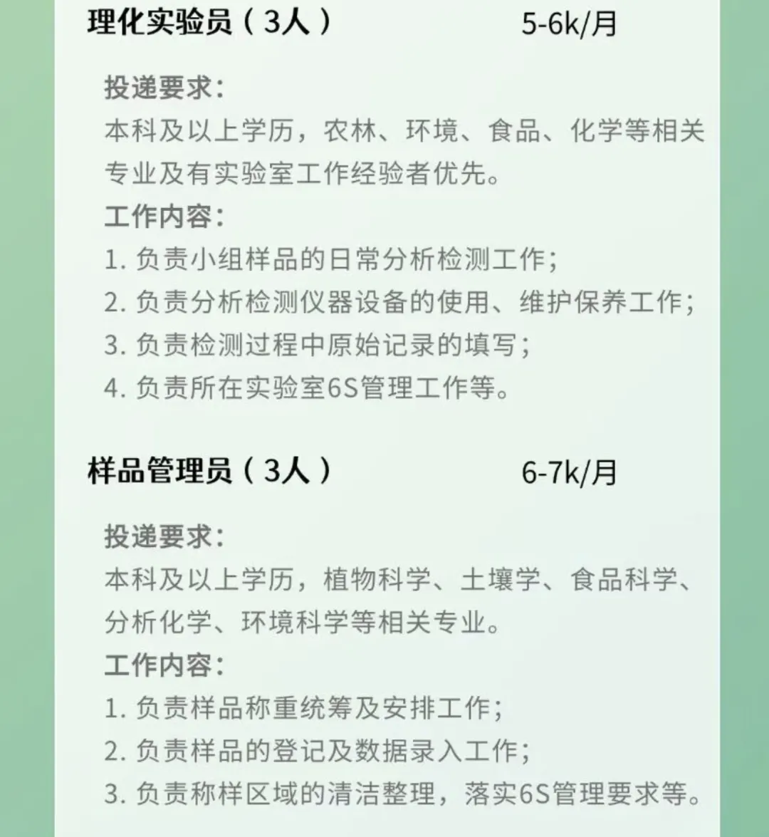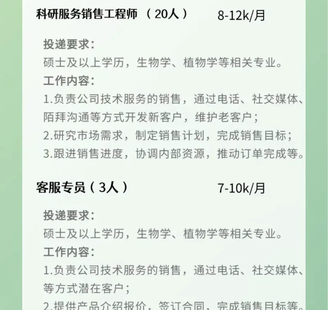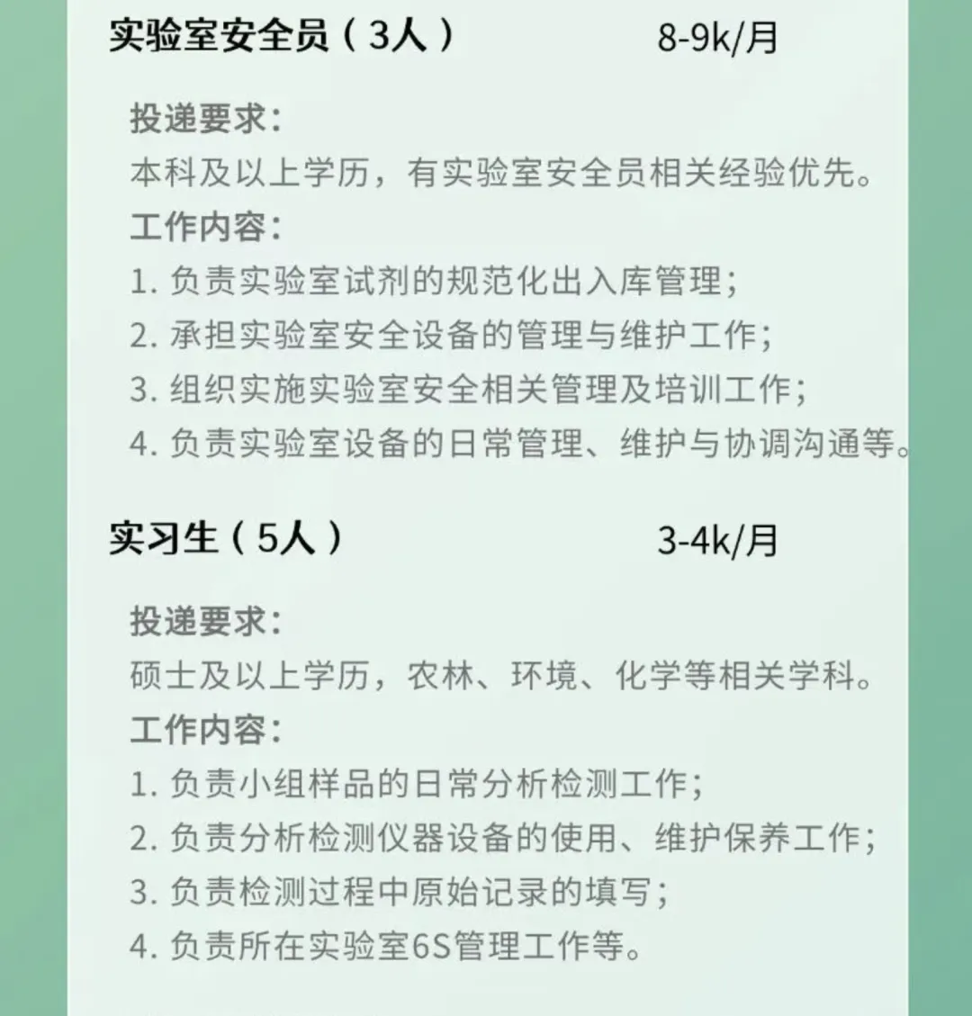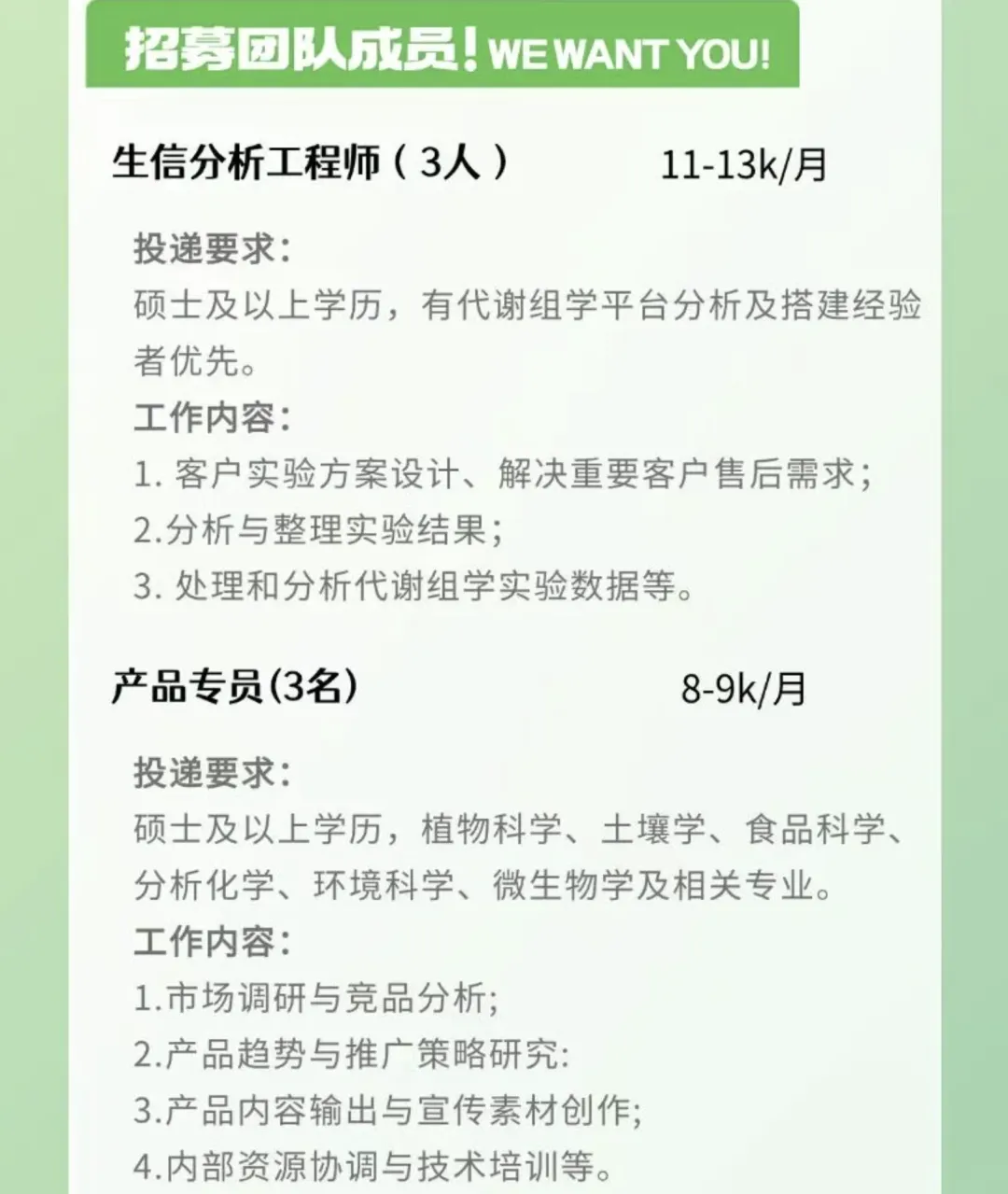 >南京大量招聘:食品生物化工实验员+生信分析+科研销售+客服+实习生