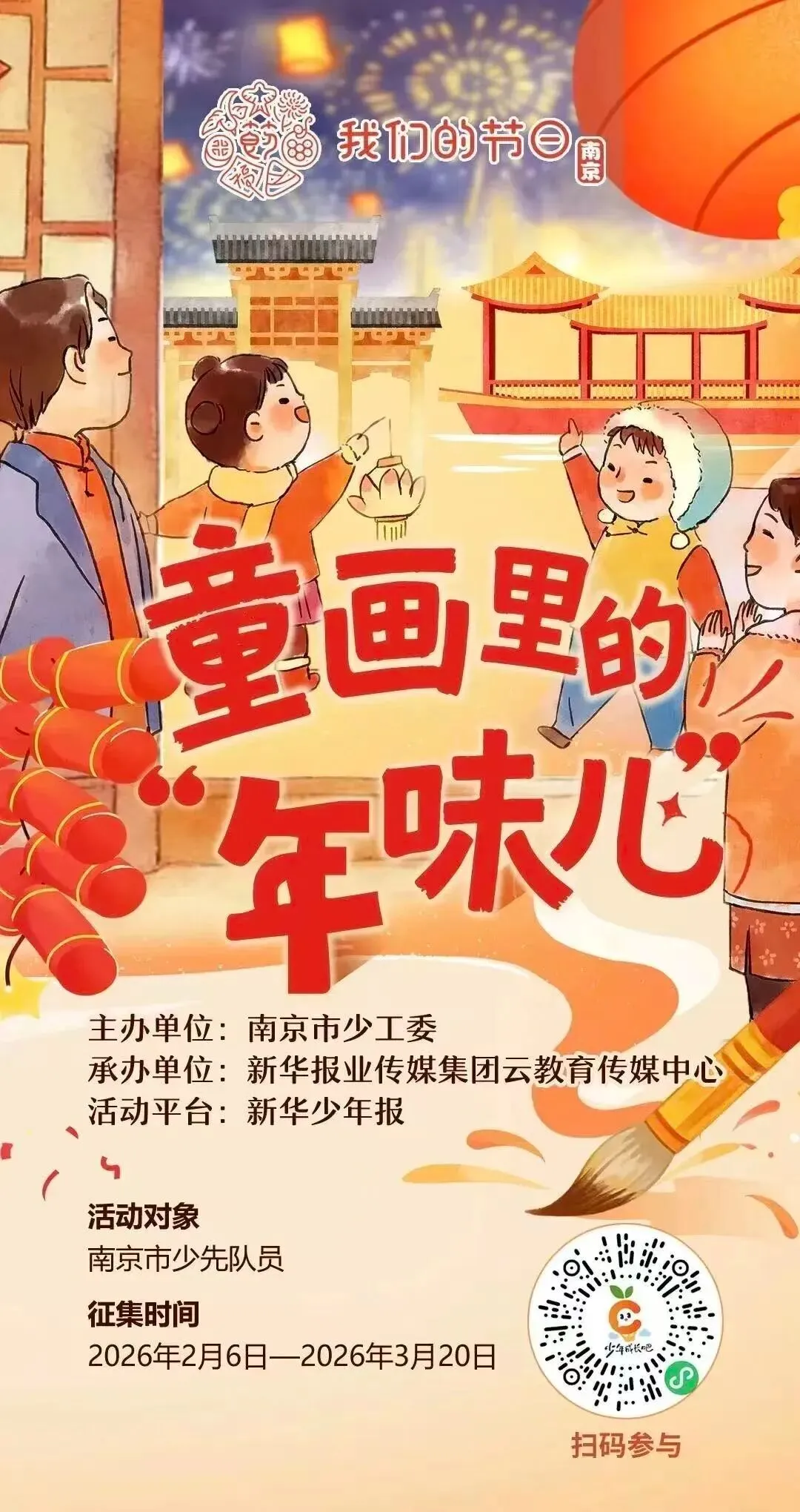中华优秀传统文化是中华民族的精神命脉,春节、元宵节等传统节日承载着辞旧迎新、团圆平安、孝老爱亲的文化内涵,是弘扬优秀传统文化、培育少先队员家国情怀的重要载体。南京市少工委拟以“我们的节日·童画里的‘年味儿’”为主题开展绘画征集活动,鼓励全市少先队员用画笔记录马年新春的烟火气与文化味,在亲身体验中感受传统节日魅力,在实践行动中传承文化基因,厚植家国情怀,展现新时代南京少先队员的精神风貌。