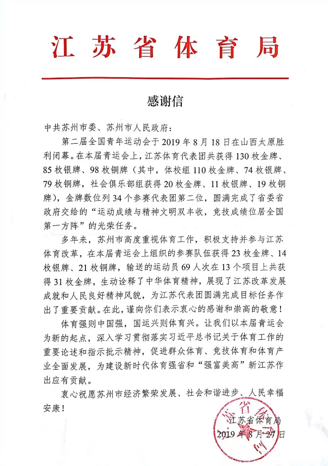 8月27日,江苏省体育局向中共苏州市委、苏州市人民政府发来感谢信,感谢苏州市高度重视体育工作,积极支持并参与江苏体育改革。