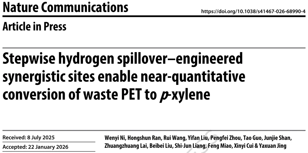 Stepwise hydrogen spillover-engineered synergistic sites enable near-quantitative conversion of waste PET to p-xylenehttps://doi.org/10.1038/s41467-026-68990-4