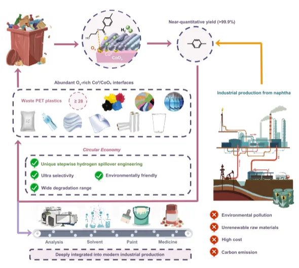 一句话概括: 本文开发了一种独特的CuCo/CoOₓ催化剂,通过逐步氢溢流机制,构筑了富含氧空位的界面活性位点,实现了将废弃PET塑料近定量(>99.9%) 地转化为高纯度对二甲苯(PX),其性能远超现有各类催化剂,并展现出优异的实际应用潜力和经济环境效益。