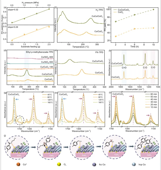 图5:构-效关系与分子机理。a)H2压与底物浓度协同影响PX产率;b)H2-TPD显示CuCo/CoOx吸附量↑且溢流H*脱附温度↑;c)时间曲线证明Co/CoOx受产物抑制;d-e)底物与PX的TPD揭示CuCo/CoOx吸附底物强、产物弱,避免自毒;f-i)原位FTIR捕获C–O键优先活化并生成醛中间体;j)提出“C–O活化→溢流H*进攻→脱羟→PX脱附”完整循环。