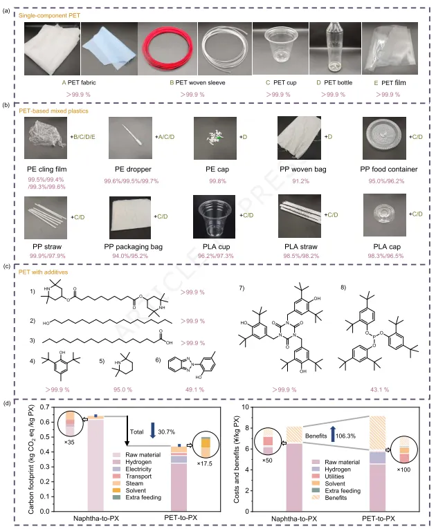 成功将28种真实废弃PET塑料(瓶片、纤维、含添加剂的制品、PET基混合塑料)高效转化为PX。