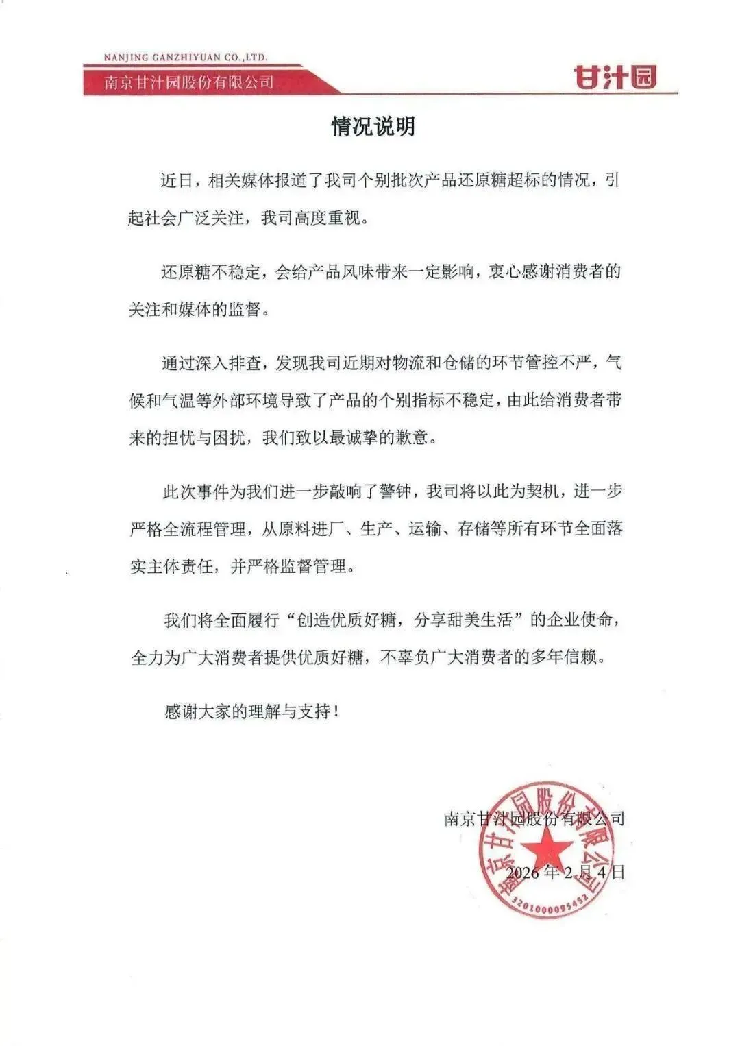 2月5日,南京甘汁园就生产销售不合格糖制品一事发布情况说明: