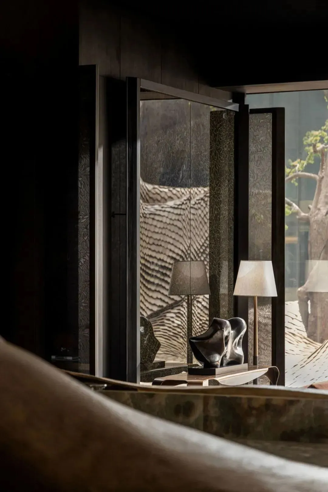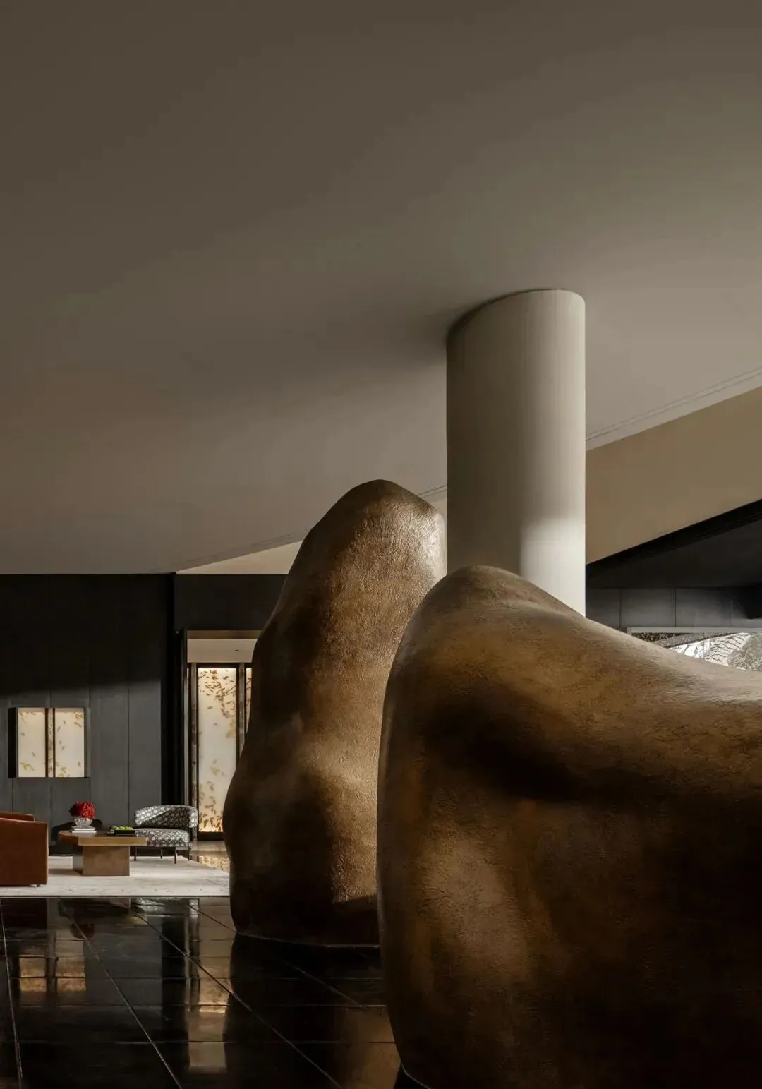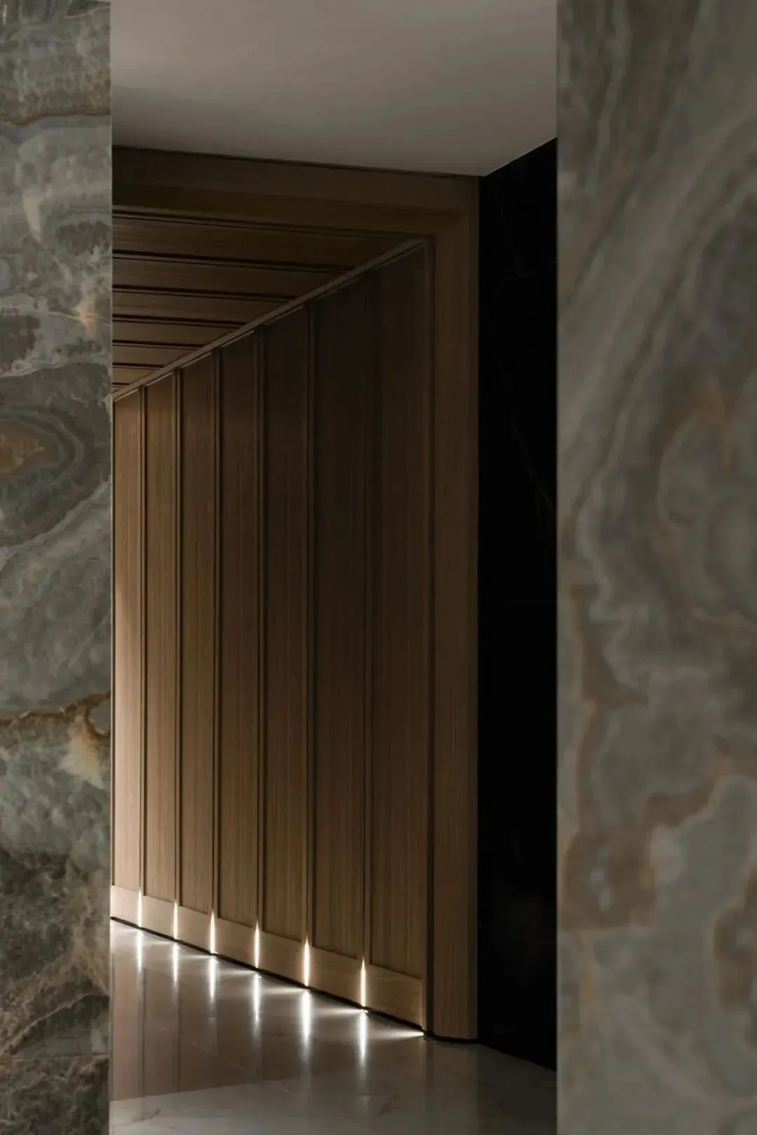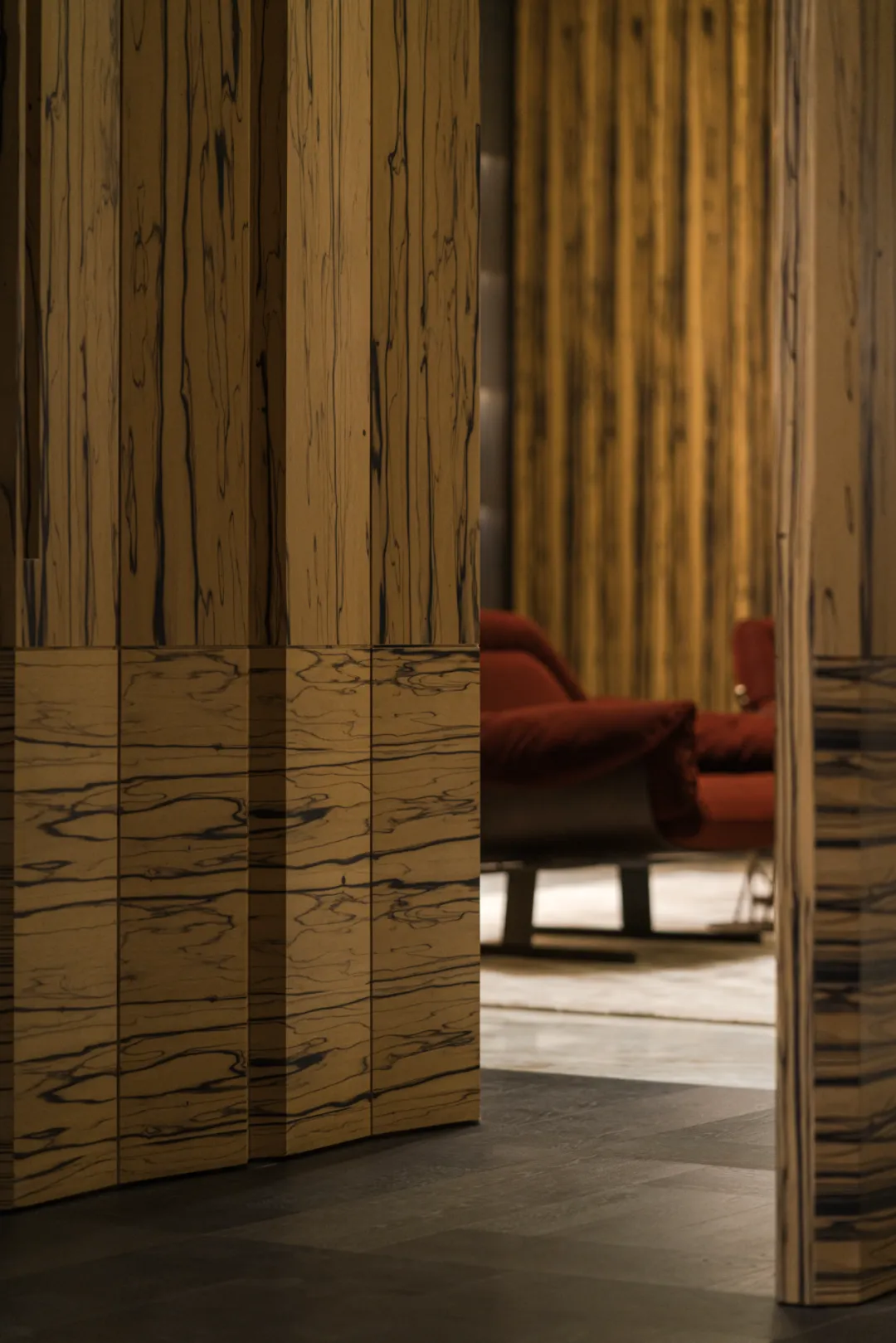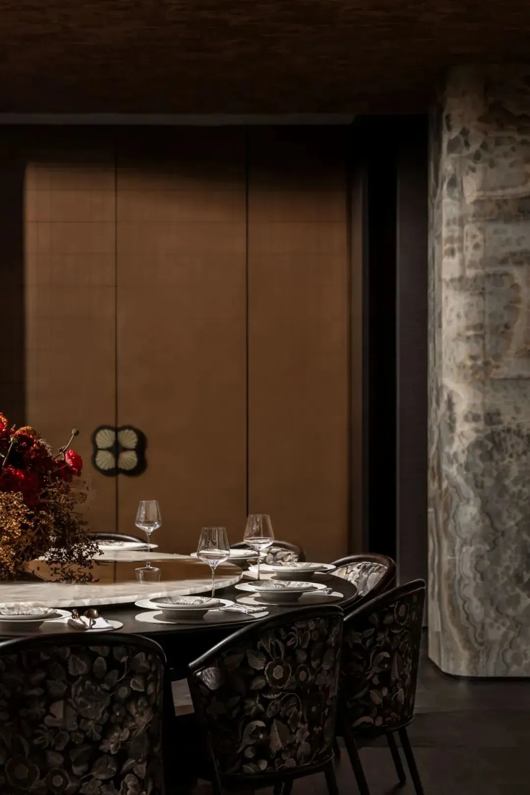 在材料的选择上,设计采用了大面积具有自然肌理的石材打造的柱体,与深色的背景木饰面结合,配合点状式光源的点缀,将空间的“隐与奢”毫不费力地显露出来。