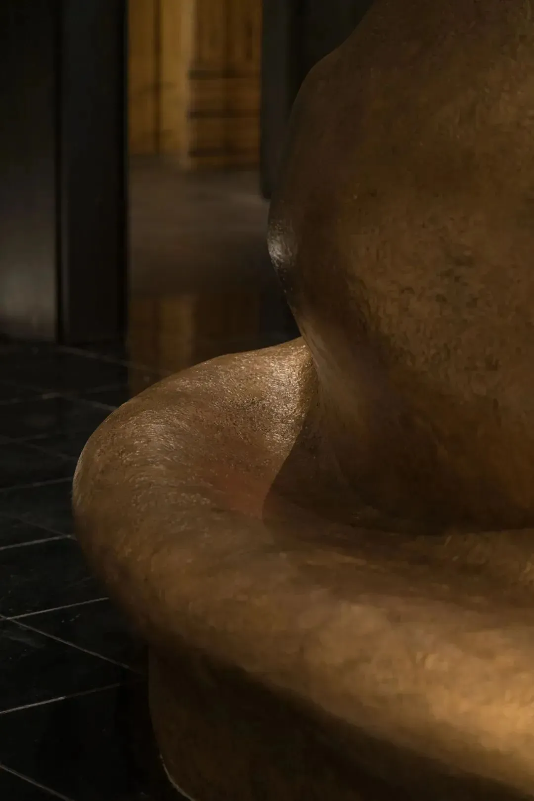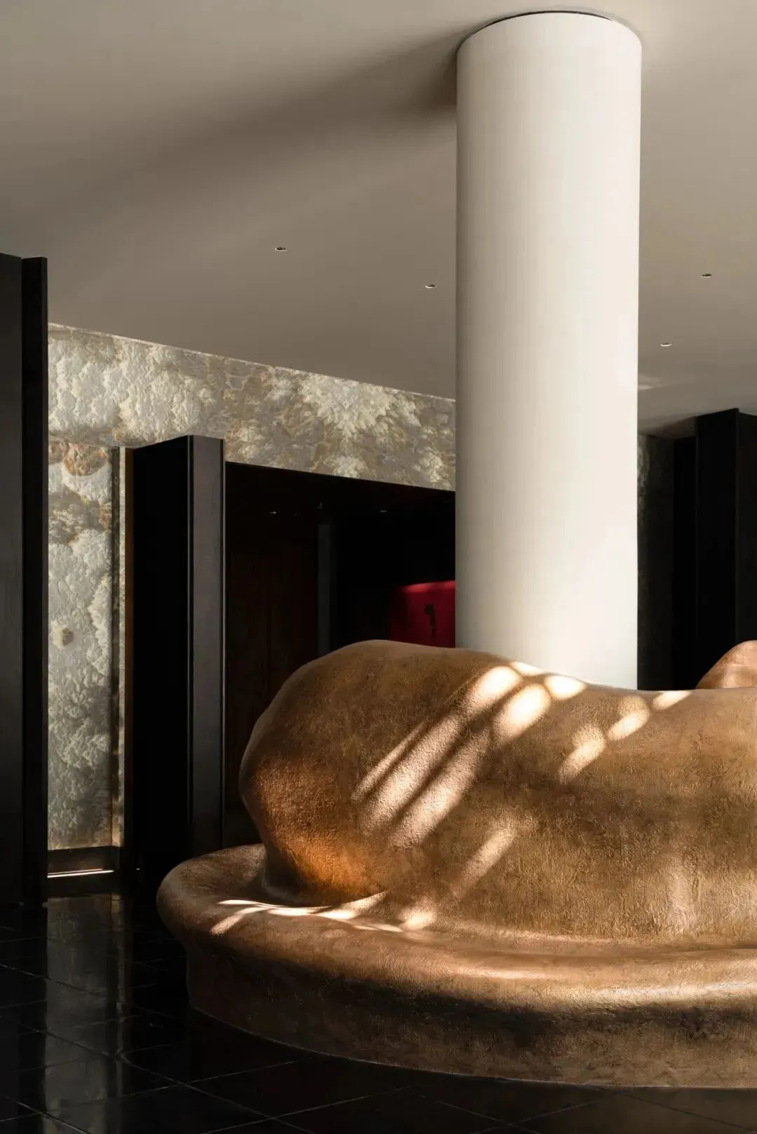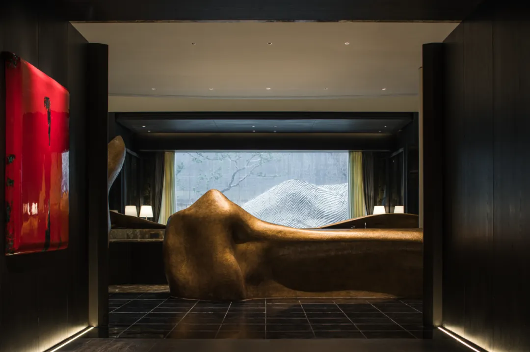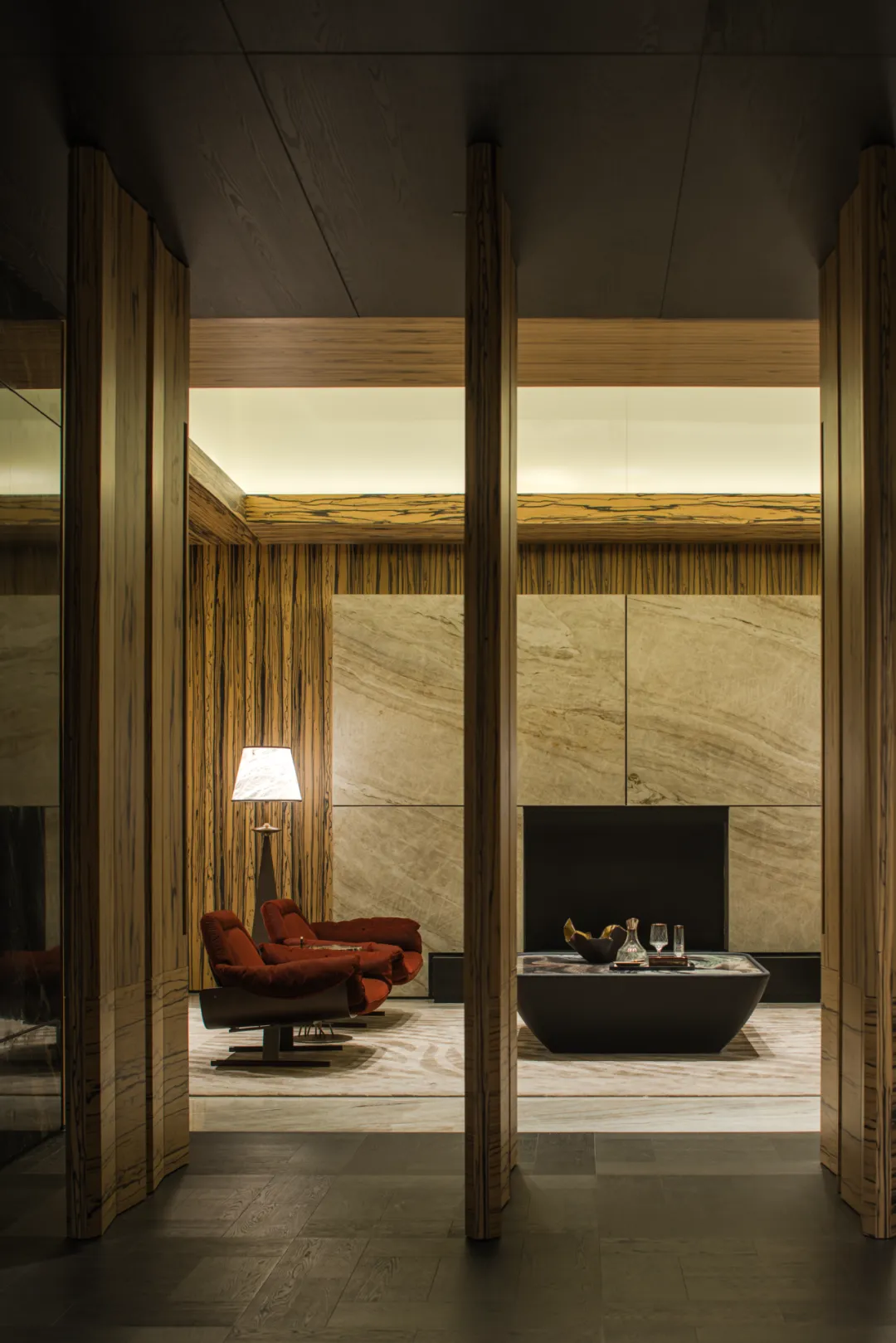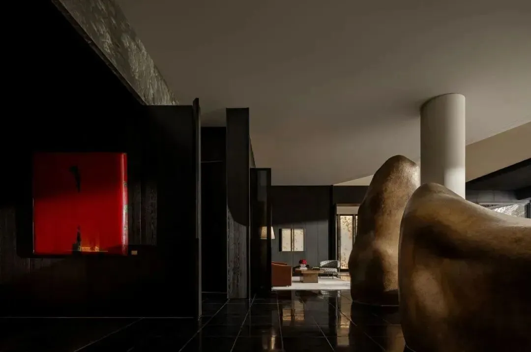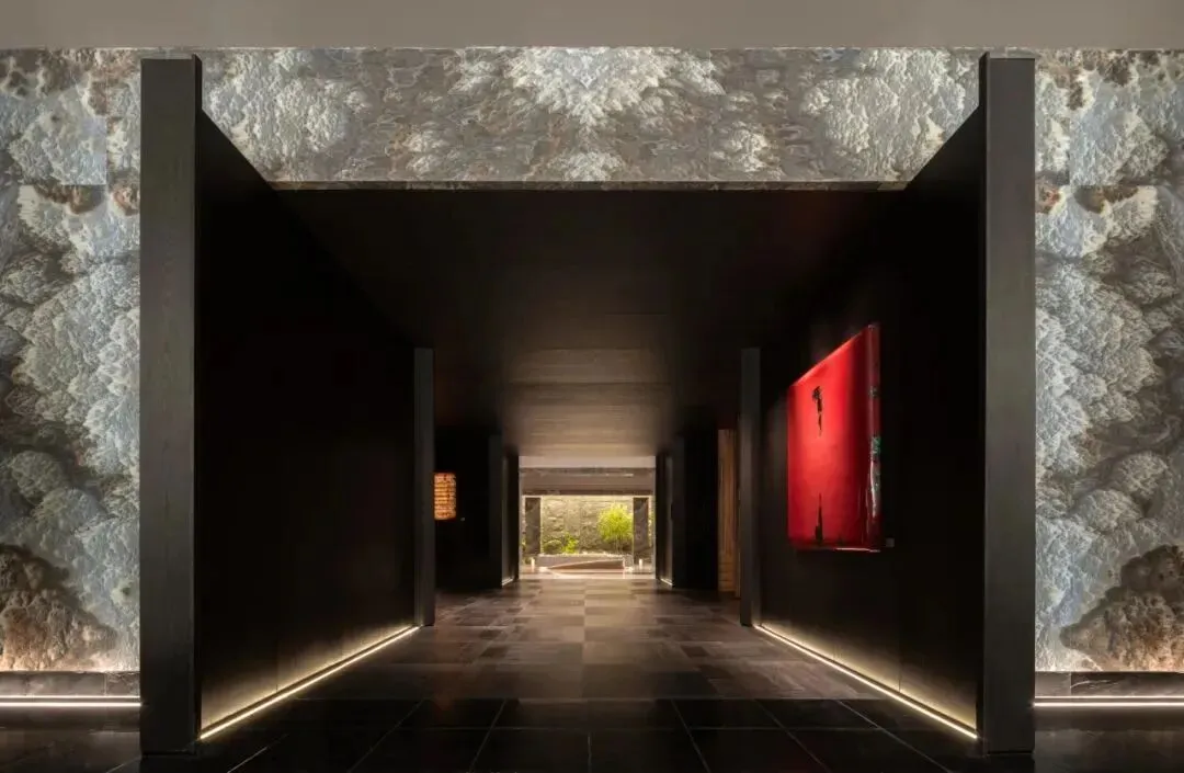 在材料的选择上,设计采用了大面积具有自然肌理的石材打造的柱体,与深色的背景木饰面结合,配合点状式光源的点缀,将空间的“隐与奢”毫不费力地显露出来。