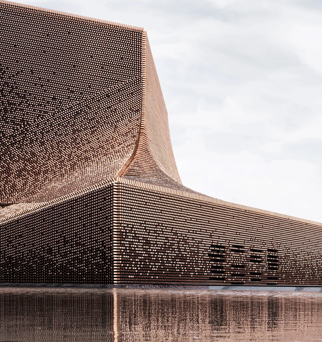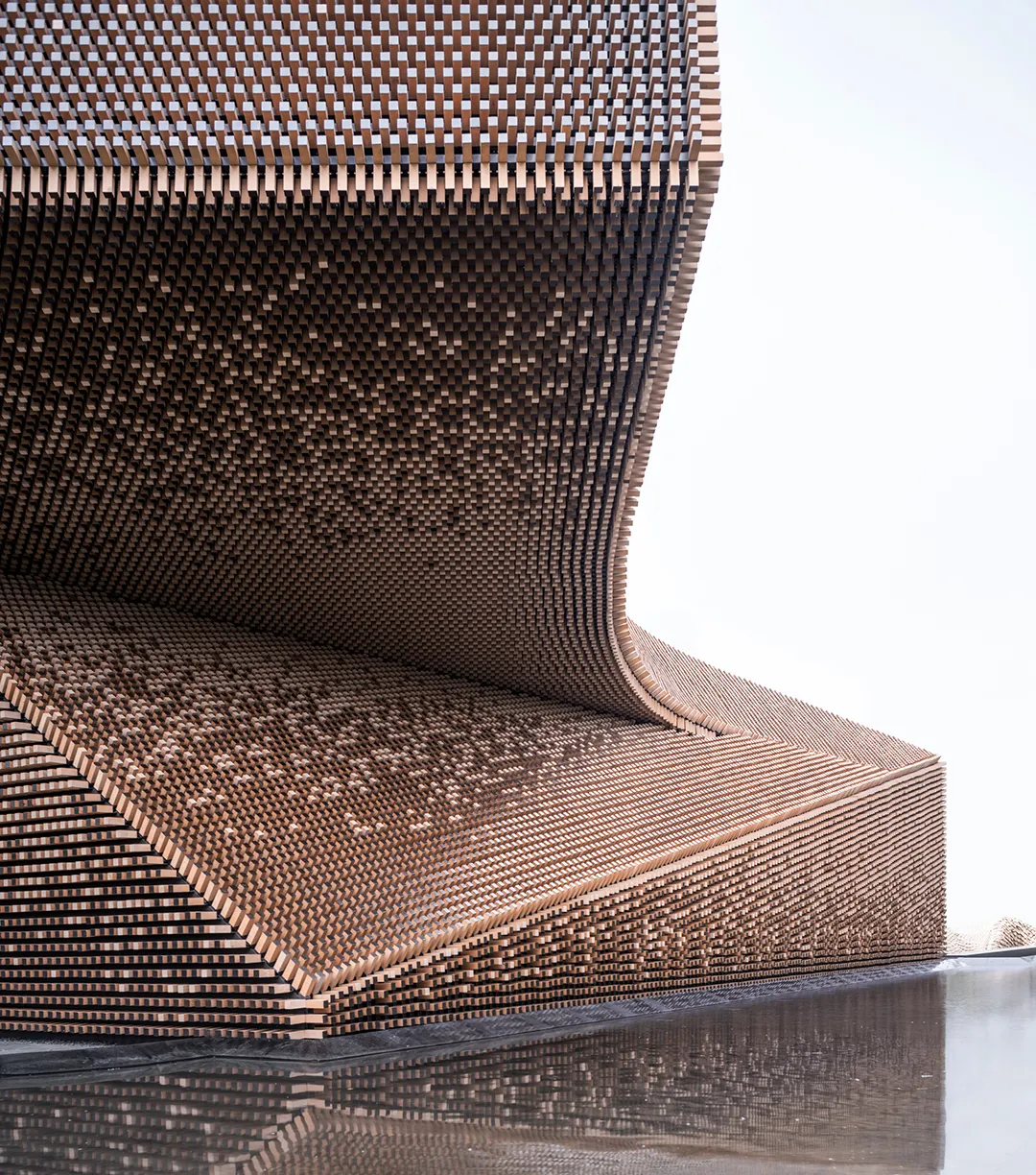 建筑整体采用了13.9万块60x60x180mm尺寸的定制陶砖作为艺术馆的立面材料,陶砖的颜色参考了现存于南京博物馆一块模印有“石头”的东晋晚期城砖,致敬南京3100年建城史及现存世界规模最大最长都城城垣的深厚文脉。13.9万块陶砖组成的矩阵通过形体的扭转,形成不断向上生长的上升气韵,打造了一个极富视觉表现力的建筑结构,生动体现了南京“有底气的稳,有边界的甩”,以及“稳中带甩”的城市性格。