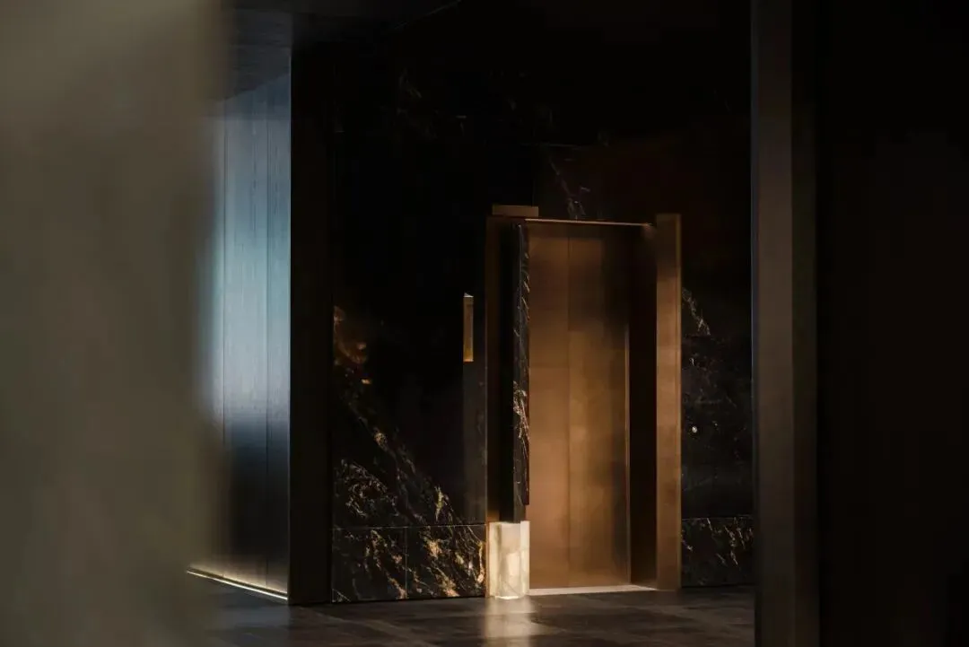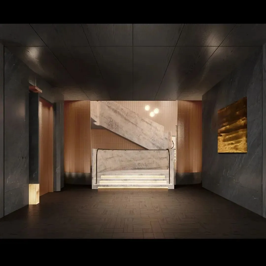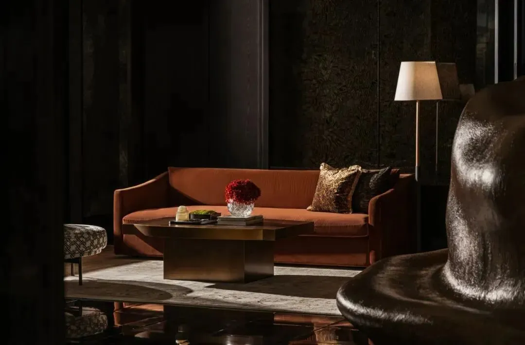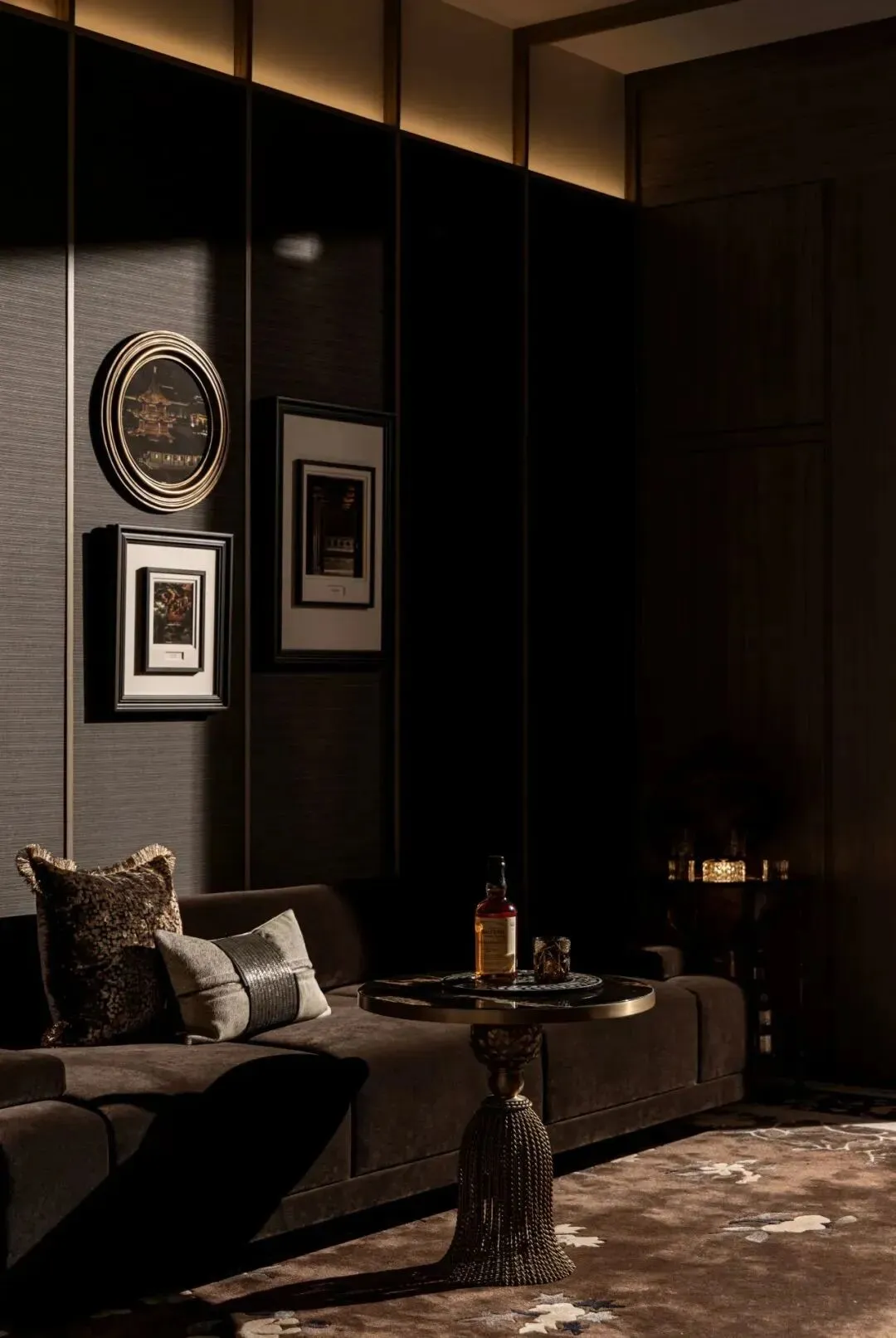 整体深色调的木饰面背景,以还原根植于南京文化的厚重底蕴为切入点,配合多处天然石材与古铜钢金属的搭配,打造品质与隐奢调性的空间感受。