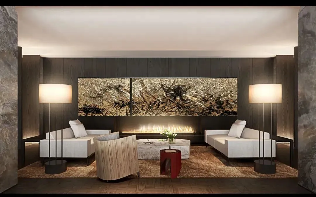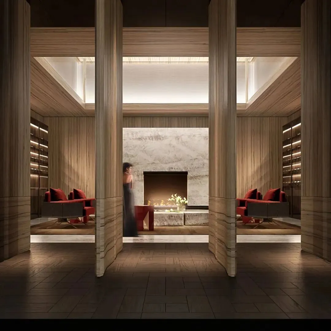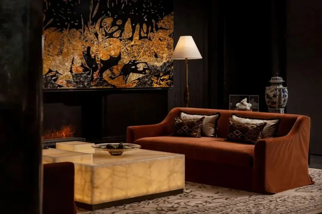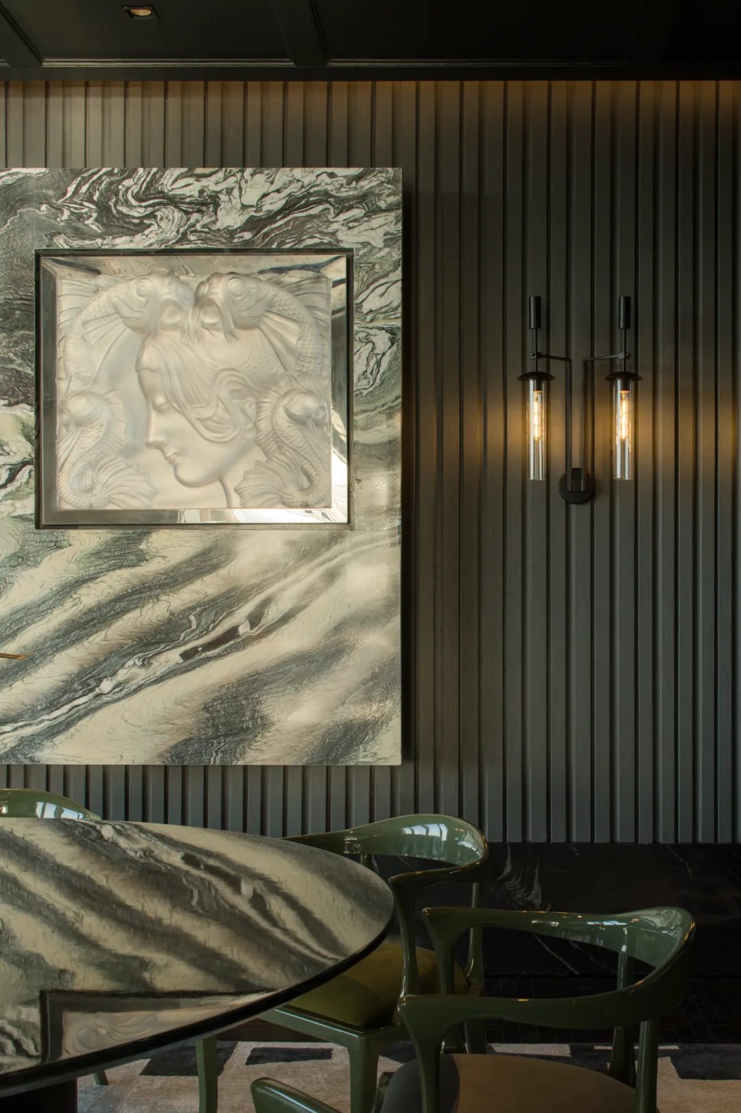 整体深色调的木饰面背景,以还原根植于南京文化的厚重底蕴为切入点,配合多处天然石材与古铜钢金属的搭配,打造品质与隐奢调性的空间感受。