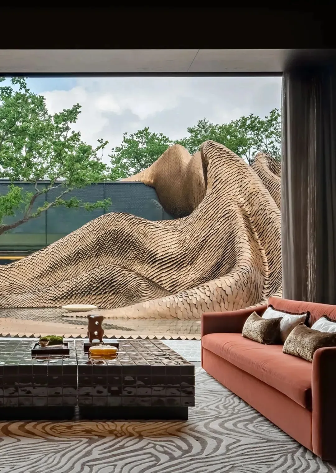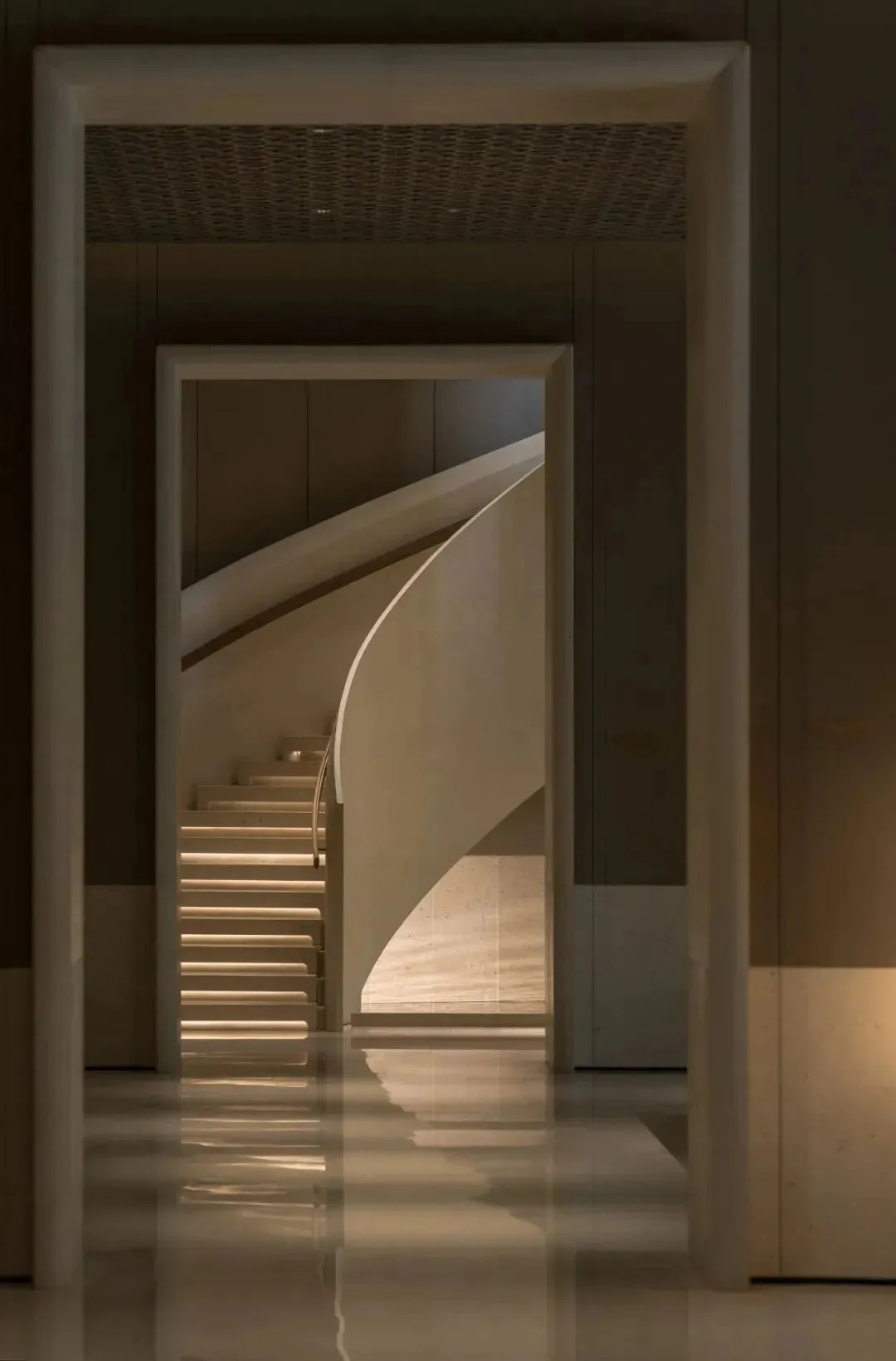 轻盈优雅的丰富层次被转化为空间设计语言,水吧台的轮廓和表面处理呈现出如同丝绸般的流动感。