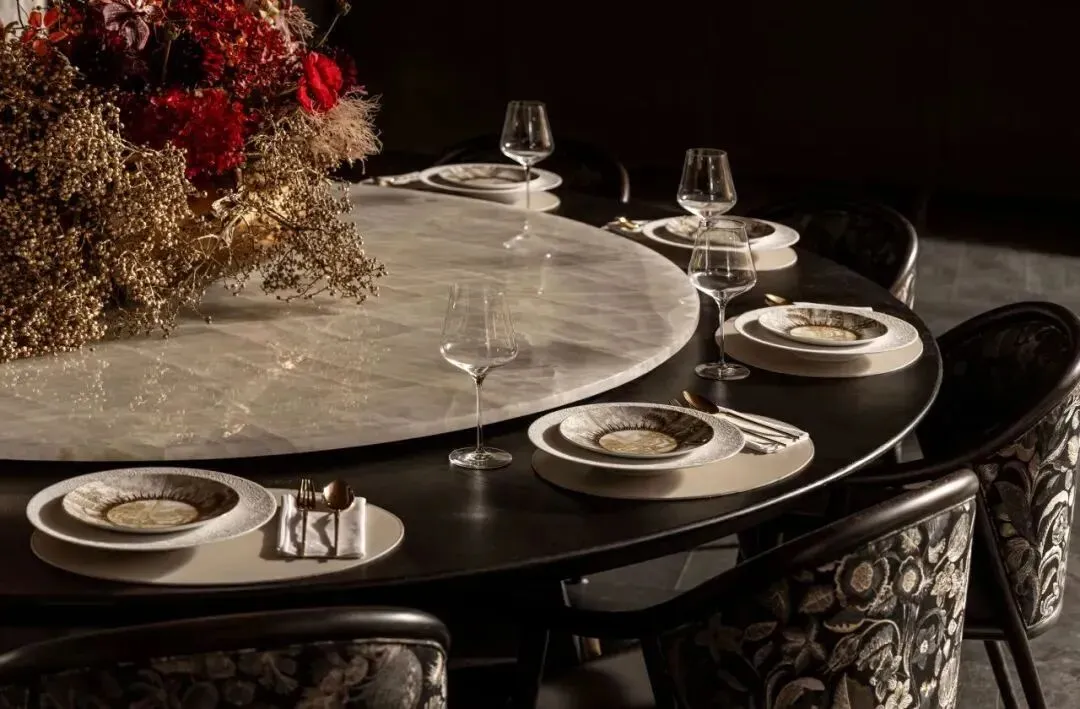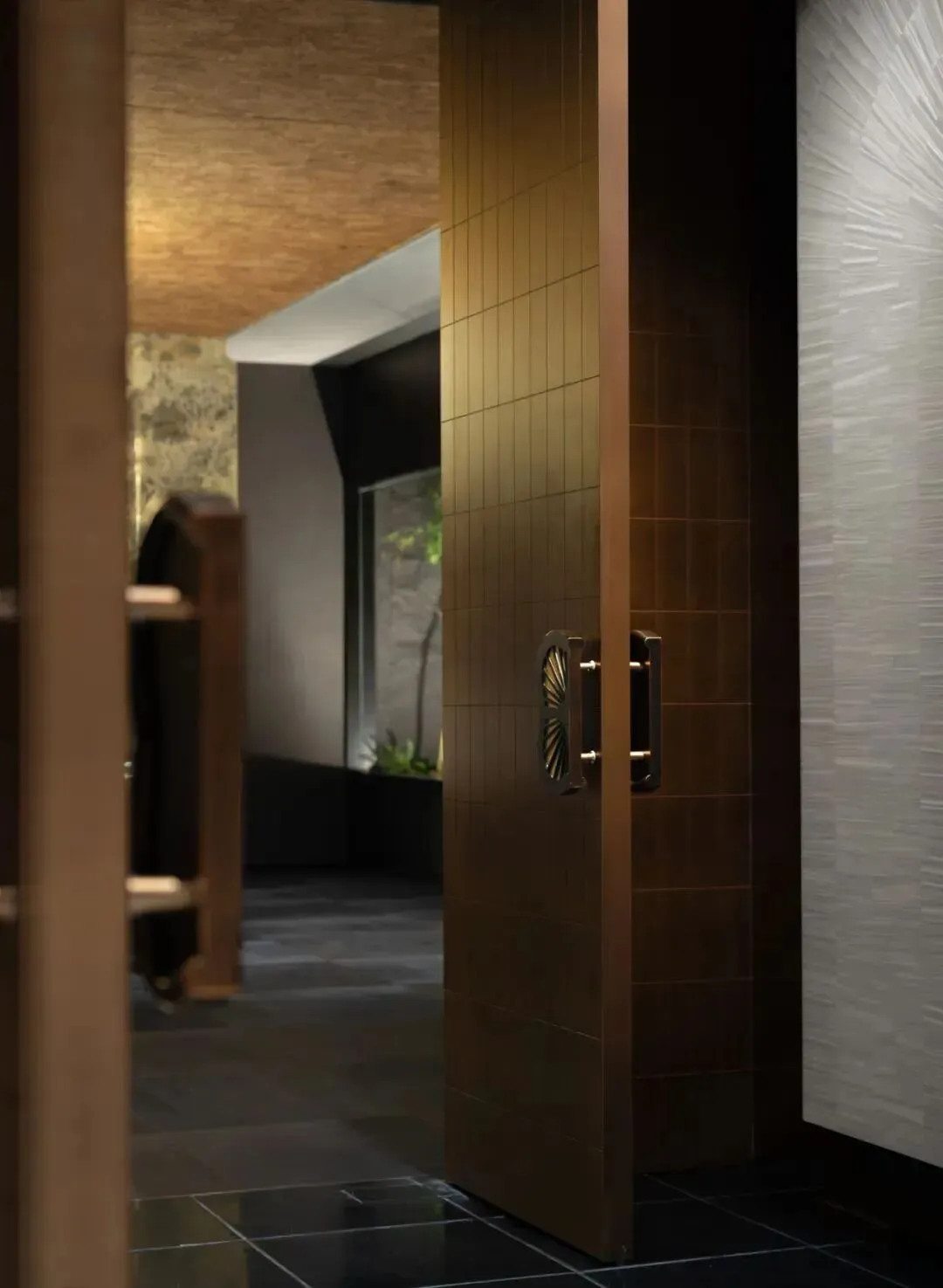两进的双开门设置,为私宴区拉开了私密奢享的进入仪式。定制的门把手,呼应了本案专属LOGO的造型灵感。