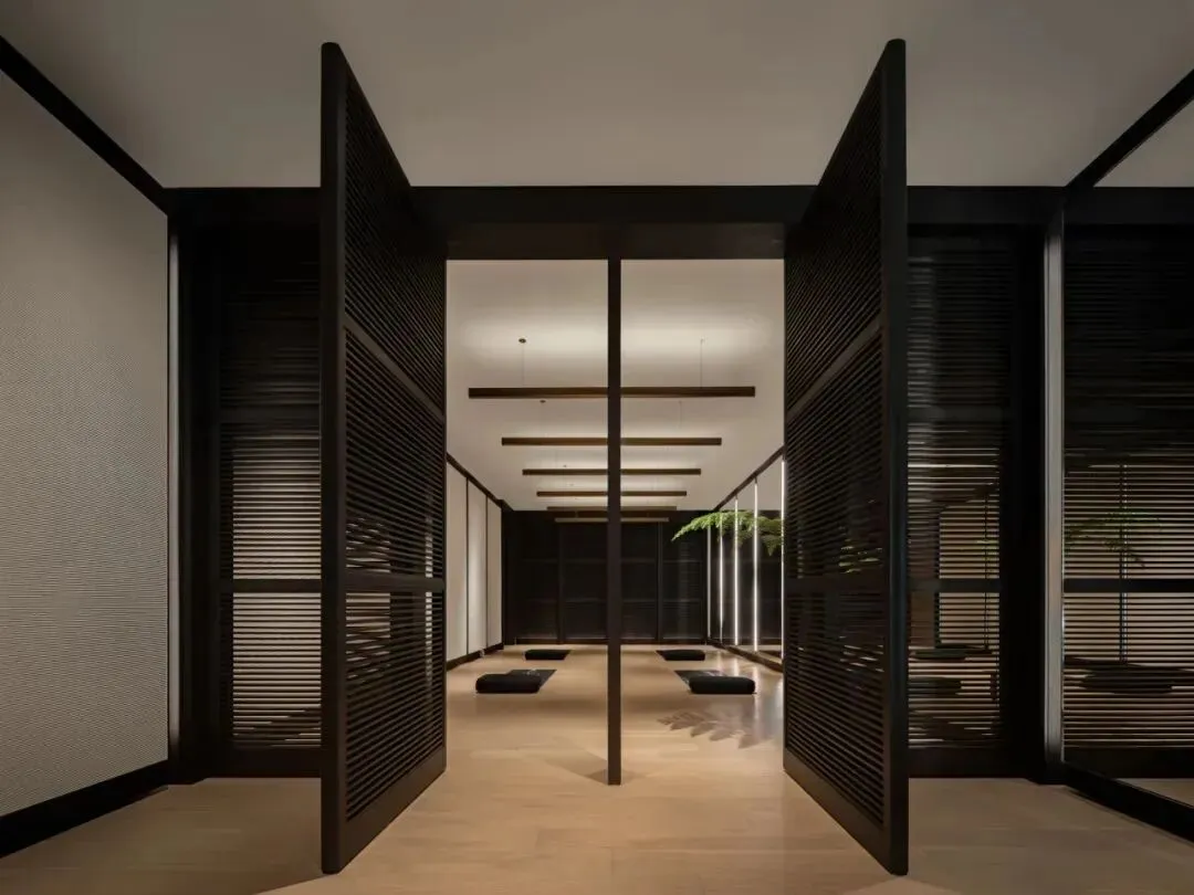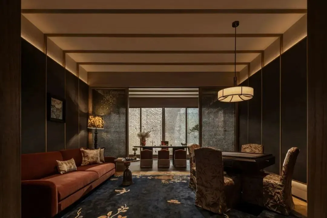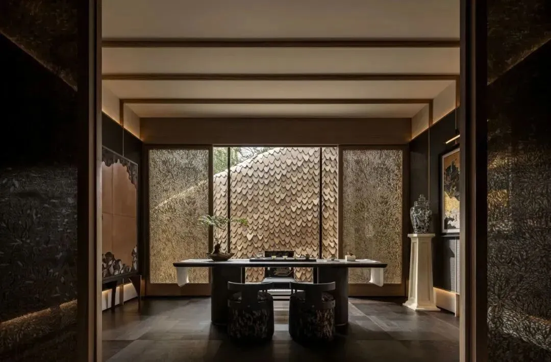 在茶室、棋牌室等内向型的功能区域,设计巧妙地采用了屏风和天花折面的形式,为原本直线条且略显狭窄的空间带来了视觉上的秩序与仪式感。