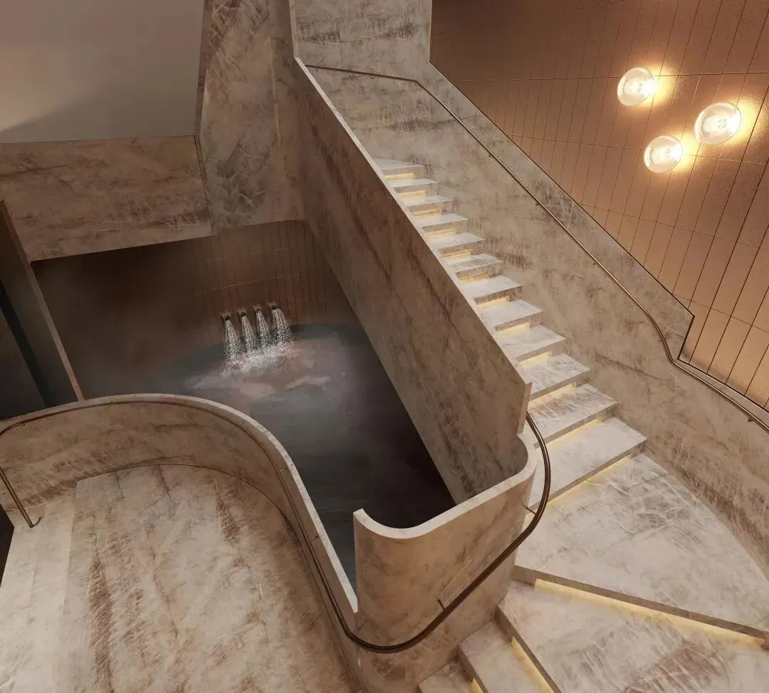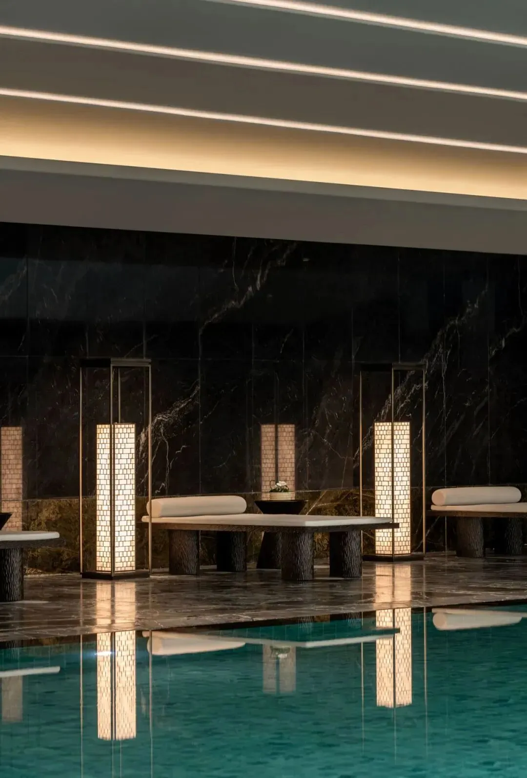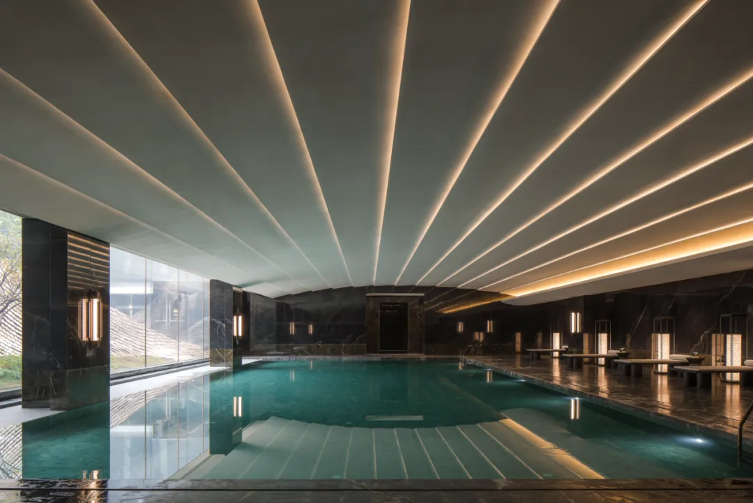 泳池空间的设计打造以营造尺度的朗阔感为核心,基于一面临景的景观优势,天花墙面创造性的引入金陵记忆中旧时乌篷船体折叠的弧度表达,通过船篷的元素演绎,为空间带来了层次与视觉的延伸。
