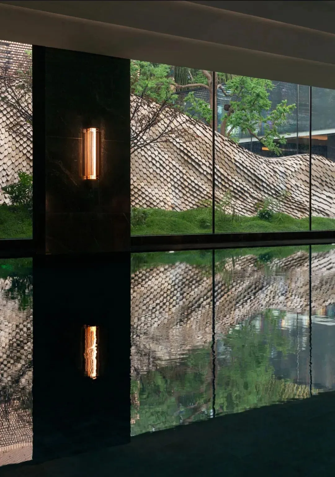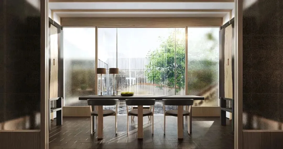 基于私宴空间内置于空间深处,缺少自然采光的空间条件,设计借助硬装的表达手法在空间内部造景,用一个矩形的内置绿植玻璃框景,以侧面的向上打开,引入了自然天光。