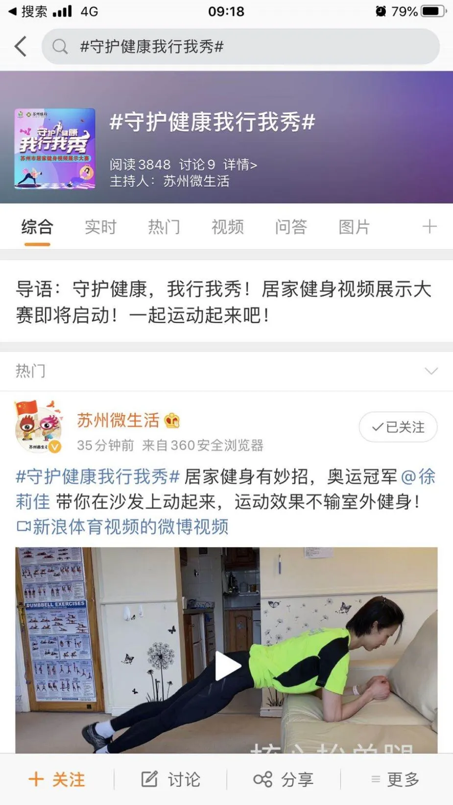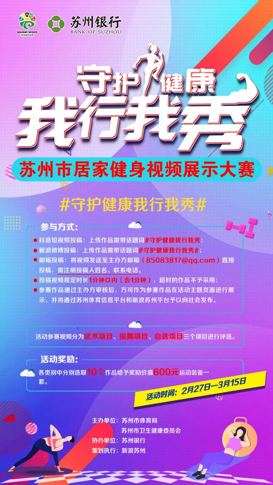2月27日-3月15日,苏州市体育局联合苏州市卫生健康委员会开展“守护健康,我行我秀”苏州市居家健身视频展示大赛。