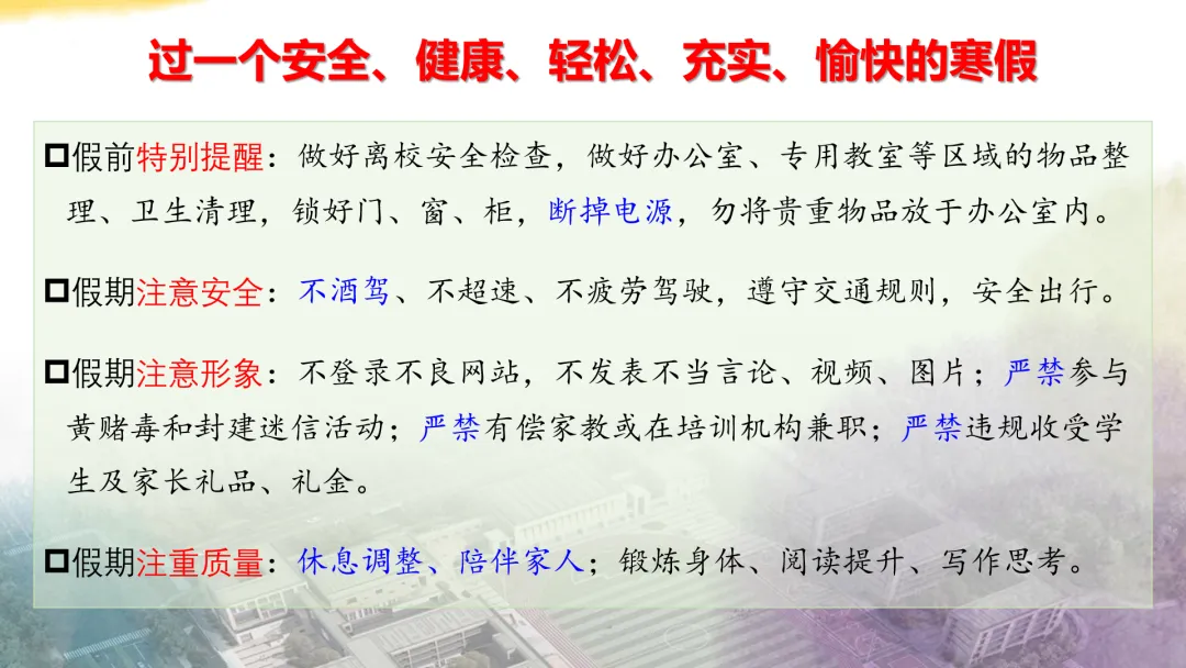 最后,杭校对教职工们的寒假生活作出特别提醒,叮嘱大家注意安全、注意形象、注意质量。祝愿全体教职工度过一个安全、健康、充实、愉快的寒假,以更饱满的状态共同奔赴学校高质量发展的新征程。