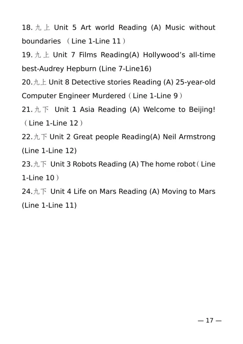 朗读短文材料及范围:提供24篇短文,分别选自译林版《英语》教材(七上至九下)。考试时将从24篇中选取1篇作为朗读测试材料。