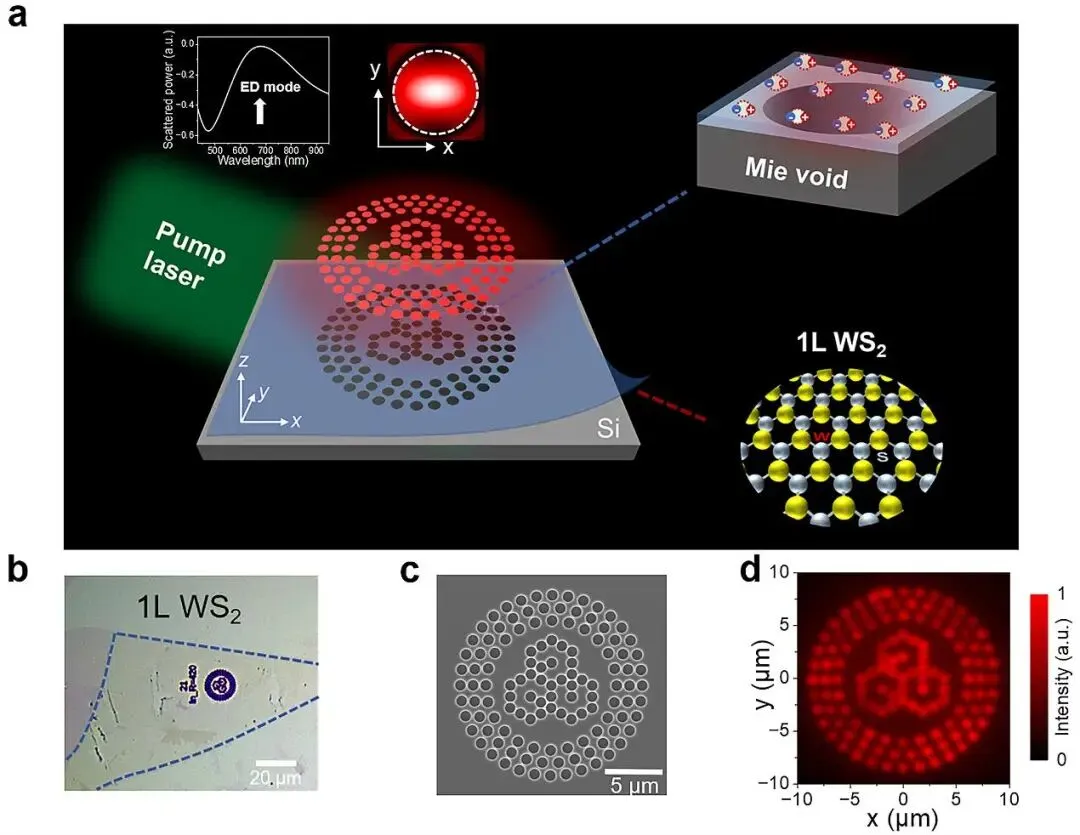 随着高分辨率、高亮度发光显示技术需求的日益增长,推动发光器件尺寸迈向微米甚至纳米级已成为迫切需求。二维半导体作为极具潜力的纳米发光材料,虽拥有优异的激子发光特性,却因其原子级厚度导致光与物质相互作用极弱,发光效率受限。传统上通过集成金属或介质纳米结构来增强发光的方法,往往面临器件尺寸过大、视场角太小或引入界面缺陷、介电屏蔽效应等问题,严重制约了发光性能。针对上述问题,中国科学院苏州纳米所张兴旺团队通过对单层二硫化钨与硅基纳米米氏空隙(Mie Void)谐振腔的集成,成功构建出一种新型二维半导体纳米激子发光器件。该结构利用纳米空隙谐振腔中局域化的空气模式,有效隔绝了周围高折射率材料引起的色散与损耗。同时,二维半导体在纳米空隙上方处于悬空状态,从根本上解决了界面接触导致的发光抑制难题。此外,纳米空隙谐振腔中形成的强局域电场能够与悬空的二维半导体高效耦合,从而将激子发光强度提升了两个量级,并显著增大了发光角度范围。最终在实验上实现了高分辨率、宽视场的发光显示器件,有望推动基于二维半导体的纳米发光显示技术的发展。该工作以Mie-Void-Enabled WS2 Excitonic Emitters with Nanoscale Footprints为题发表在Nano Letters上(请点击“阅读原文”查看论文)。中国科学院苏州纳米所博士生廖银昌为该论文的第一作者,张兴旺研究员为论文通讯作者。该研究获得了国家自然科学基金、国家重点研发计划、江苏省科学技术厅和苏州市科学技术局等项目的支持,同时也得到了中国科学院苏州纳米所纳米真空互联实验站(Nano-X)、纳米加工平台的支持。图1. 基于硅基纳米空隙谐振腔的二维半导体纳米激子光源