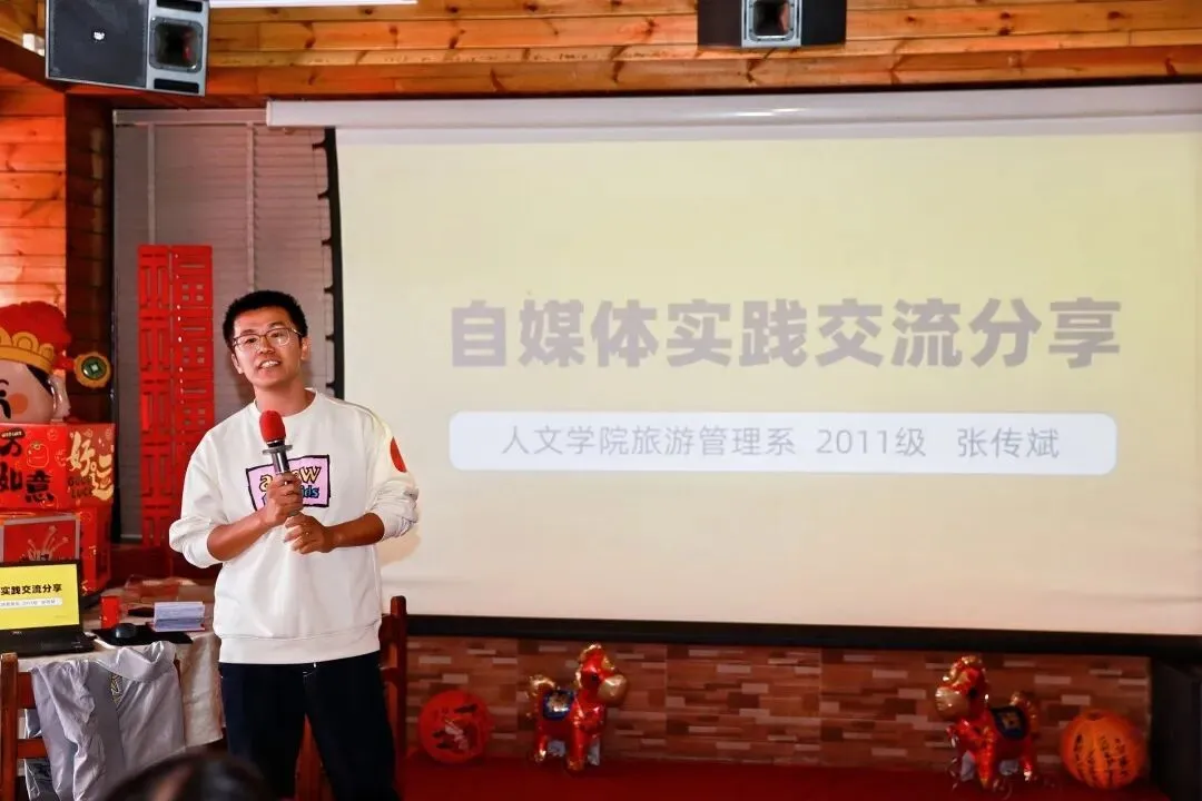 下午3时,两场干货满满的沙龙成为年会亮点。校友张传斌(2011级旅游管理系,小红书账号“文化君快跑”)以“自媒体实践与个人品牌打造”为题,分享了从零到1.1万粉丝的商业变现之路。他提出的“兴趣—专业—职业”三位一体定位法,聚焦企业文化领域,通过干货输出与“活人感”互动塑造专业人设,其分享的实用模板与社群运营经验让在场校友受益匪浅。