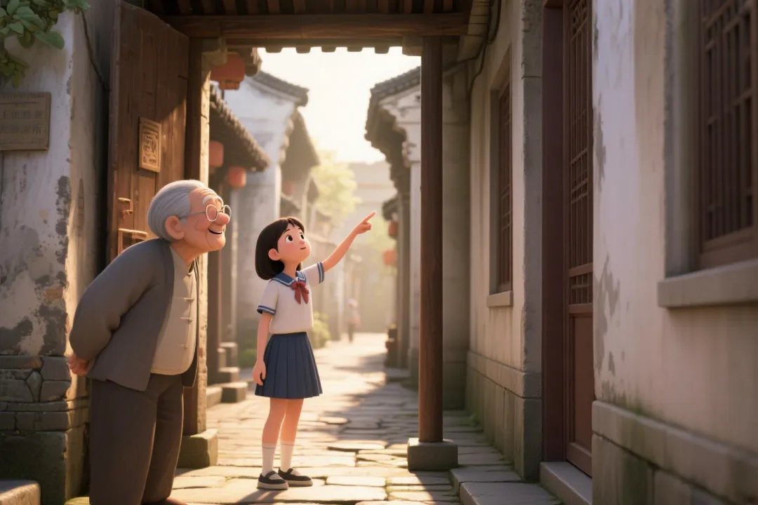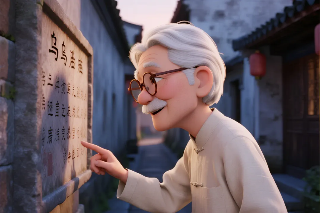 巷口的石碑上,刻着这首流传千古的《乌衣巷》,字迹遒劲有力,诉说着昔日的繁华与沧桑。一位白发苍苍的老者正驻足品读,他身着素色长衫,鼻梁上架着老花镜,指尖轻轻抚过石碑上的文字,眼神里满是敬畏与沉醉,仿佛在与千年前的诗人隔空对话。