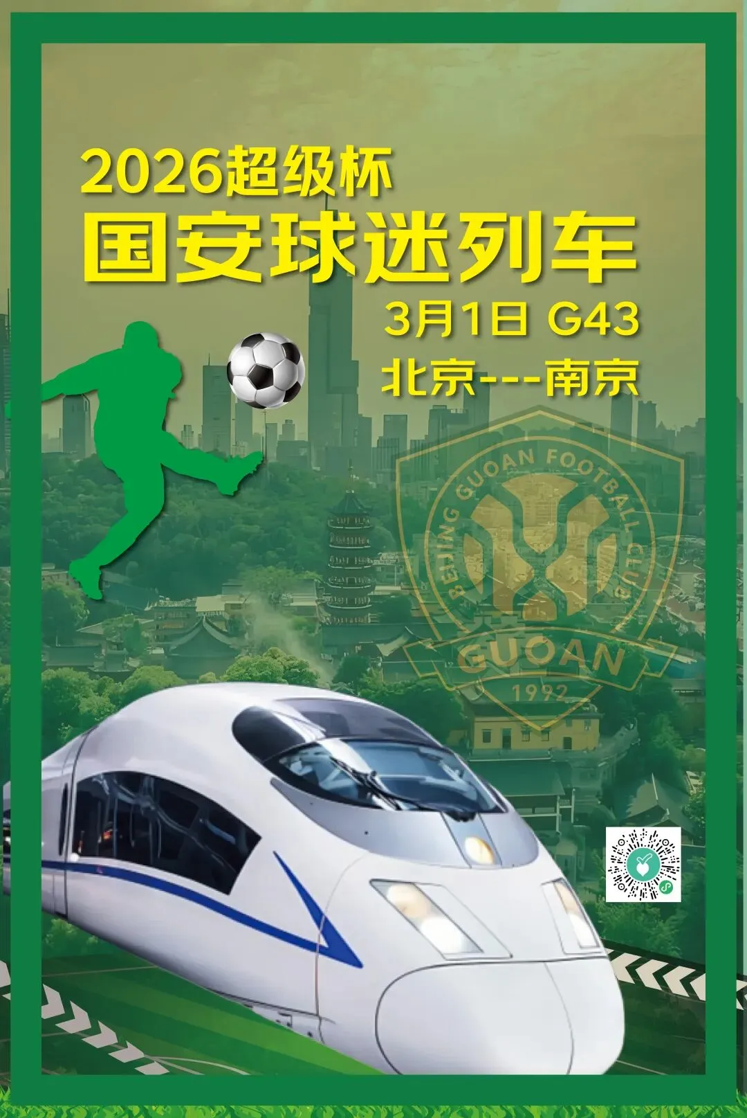 超级杯比赛正值春运及开学期间,为了保证国安球迷往返南京观赛,铁路部门正在研判通过加开编组,增大运力。推进开通了3月1日北京南9:03-12:29到南京南G43国安球迷观赛列车,现国安球迷可于2月6日12点至2月9日每天12点扫码购票报名,2月9日报名结束将无法退票,此报名仅为高铁票,不含观赛球票。