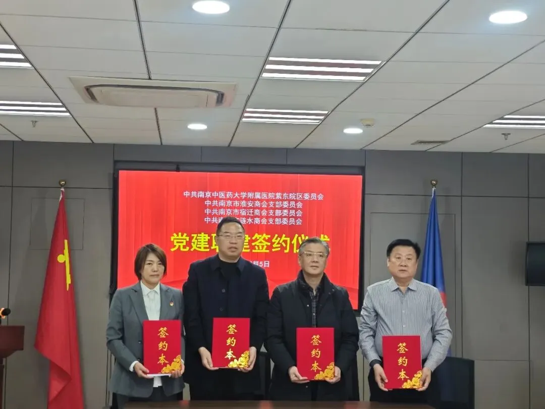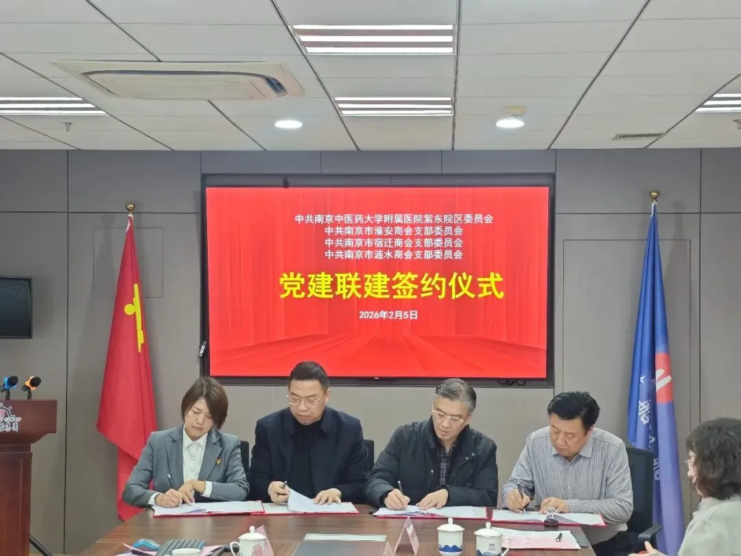 2026年2月5日,中共南京中医药大学附属医院紫东院区委员会与南京市淮安、宿迁、涟水商会党组织党建联建签约仪式在南京苏汇大厦隆重举行。本次活动以“党建联建聚合力,杏林春暖促健康”为主题,旨在通过党建共建推动医疗与商会资源深度融合,服务在宁企业家健康需求,赋能企业发展。南京市淮安商会会长羊栋、顾问徐洪军、党支部书记朱钦愉等代表商会出席签约仪式。