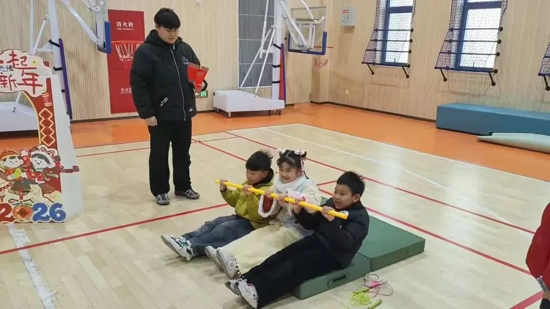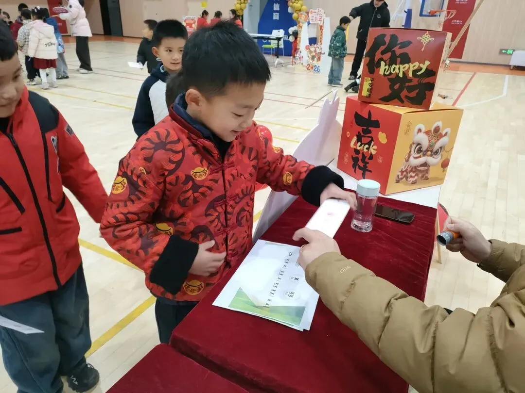 活动现场童趣盎然、秩序井然。上午 8:20,一年级学子怀揣期待,在班主任的带领下有序进入体育馆开启闯关之旅。孩子们首先抽取福签,写下对新年的美好憧憬,随后手持福签逐一挑战各个关卡。