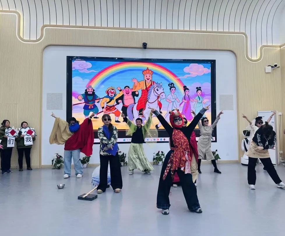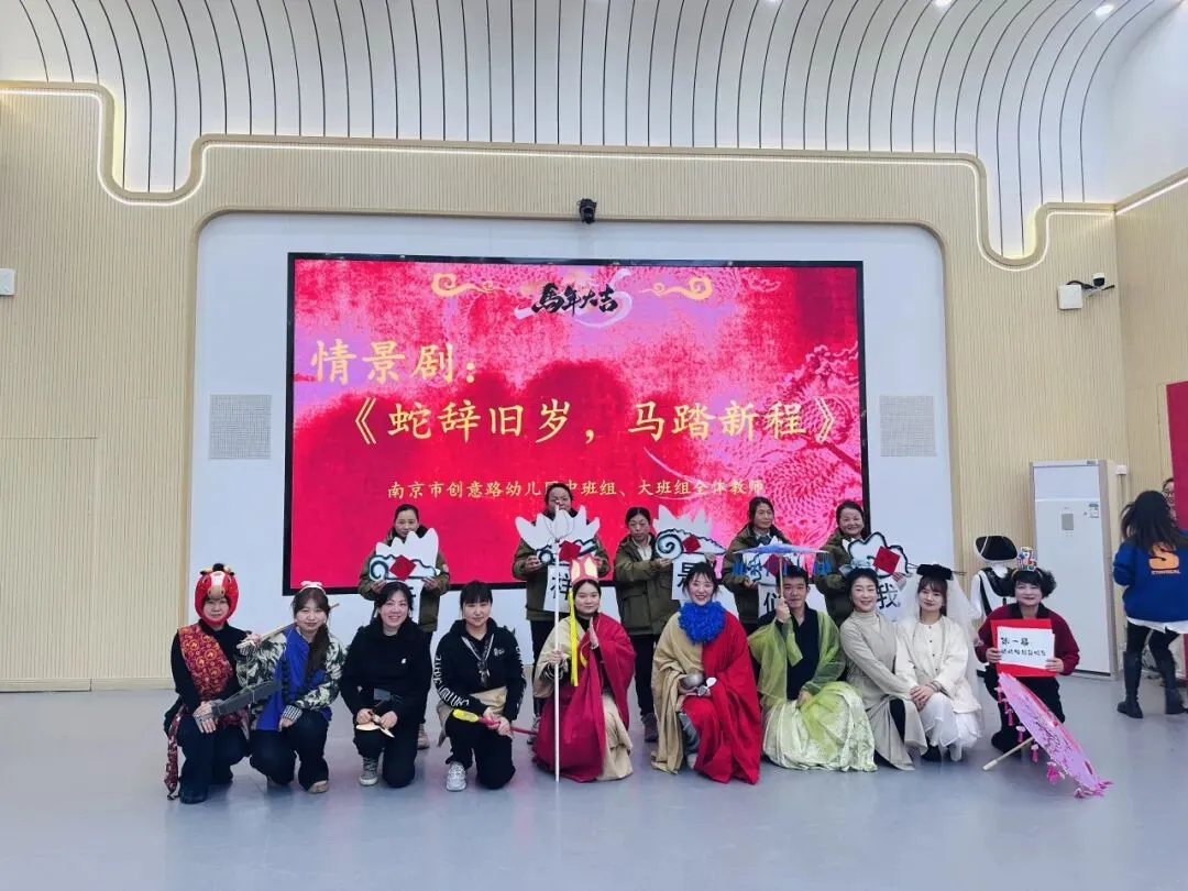 南京市创意路幼儿园中班组、大班组全体教师携手演绎情景剧《蛇辞旧岁 马踏新程》。剧情紧扣辞旧迎新的主题,融入幼教工作中的温暖片段,以生动鲜活的表演,回顾过往岁月的并肩同行,传递对马年新征程的美好期许,既展现了老师们的多才多艺,更彰显了幼教团队的凝聚力与向心力。