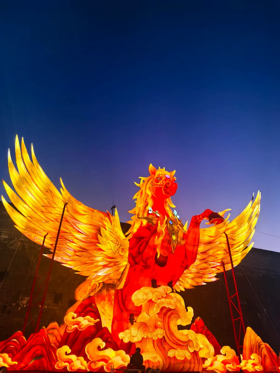 作为灯会主灯,老门东主街入口的“赤焰神骏耀金陵”巨型灯组,以展翅欲飞的飞马为核心造型,高达15米、宽28米,气势恢宏,亮灯后灯火璀璨,瞬间成为社交平台的打卡顶流。