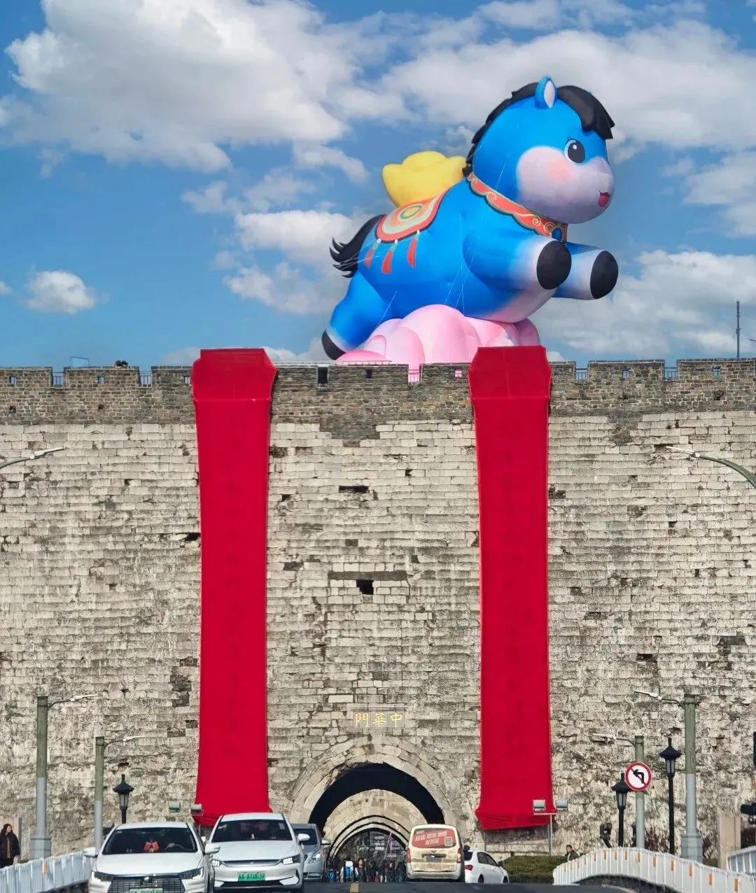 中华门城墙上的“小蓝马”,则是另一种可爱画风。这只巨型充气马灯,通体湛蓝,胖乎乎的身体搭配粉嫩的云彩,灵动又可爱,与古色古香的城墙形成了鲜明的反差,萌化了无数游人的心。