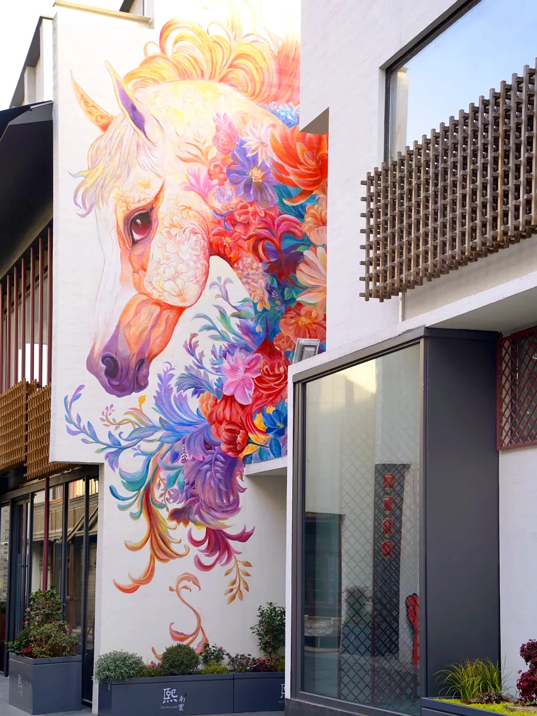 熙南里走马巷的创意马年墙绘,更是藏着不期而遇的惊喜。这里的墙绘线条灵动,画中的马匹姿态矫健,身姿舒展,与青砖黛瓦的老城南背景完美融合,古色古香中又透着几分灵动。